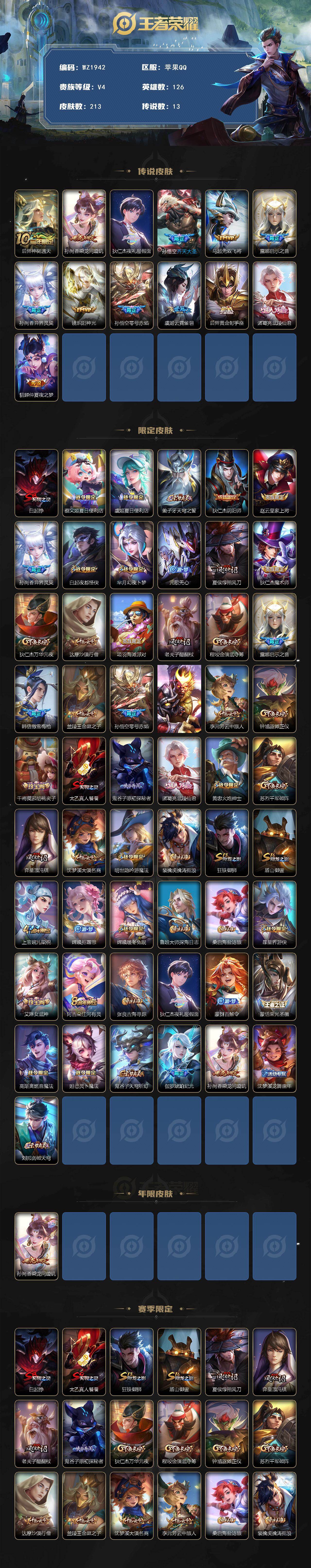 [17000109]苹果Q-213皮肤-13传说-54史诗 【英雄全皮】:孙权全皮 【传说皮肤】:后羿神树通天,孙尚香乘龙问璇玑,狄仁杰夜礼服假面,孙悟空齐天大圣,马超无双飞将,露娜启示之音,孙尚香异界灵契,镜炽阳神光,孙悟空零号赤焰,虞姬云霓雀翎,后羿黄金射手座,诸葛亮武陵仙君,貂蝉仲夏夜之梦 【限定皮肤】:白起狰,蔡文姬夏日便利店,虞姬夏日便利店,姜子牙天穹之誓,狄仁杰阴阳师,赵云皇家上将,孙尚香异界灵契,白起夜都怪侠,芈月幻夜卜梦,元歌无心,夏侯惇朔风刀,狄仁杰魔术师,狄仁杰万华元夜,达摩沙漠行僧,项羽海滩派对,老夫子醍醐杖,程咬金演武夺筹,露娜启示之音,韩信傲雪梅枪,兰陵王金庭之子,孙悟空零号赤焰,孙悟空齐天大圣,李元芳云中旅人,钟馗驱傩正仪,干将莫邪胡桃夹子,太乙真人饕餮,鬼谷子原初探秘者,诸葛亮武陵仙君,黄忠火炮绅士,苏烈千军破阵,弈星混沌棋,沈梦溪大漠名商,明世隐吟游魔法,裴擒虎擒涛扼浪,狂铁御狮,盾山御銮,上官婉儿梁祝,嫦娥拒霜思,嫦娥暖冬兔眠,鲁班大师探海日志,桑启海盐诗旅,暃星界游侠,艾琳女武神,阿古朵江河有灵,张良古海寻踪,狄仁杰夜礼服假面,蒙犽百解令,蒙恬荣光圣徽,高渐离燃音魔法,妲己灵卜魔法,鬼谷子天穹祈灯,伽罗琥珀纪元,孙尚香乘龙问璇玑,沈梦溪龙舞盛年,刘邦剑破天穹 【年限皮肤】:孙尚香乘龙问璇玑 【赛季限定】:白起狰,太乙真人饕餮,狂铁御狮,盾山御銮,夏侯惇朔风刀,弈星混沌棋,老夫子醍醐杖,鬼谷子原初探秘者,狄仁杰万华元夜,程咬金演武夺筹,钟馗驱傩正仪,苏烈千军破阵,达摩沙漠行僧,兰陵王金庭之子,沈梦溪大漠名商,李元芳云中旅人,桑启海盐诗旅,裴擒虎擒涛扼浪,鲁班大师探海日志,张良古海寻踪,鬼谷子天穹祈灯,刘邦剑破天穹,姜子牙天穹之誓,东皇太一噬灭天穹,甄姬逆浪荇歌,亚瑟荣光之誓,蒙恬荣光圣徽,牛魔星界战将,项羽九幽镇关 【战令限定】:黄忠火炮绅士,芈月幻夜卜梦,明世隐吟游魔法,白起夜都怪侠,暃星界游侠,嫦娥暖冬兔眠,高渐离燃音魔法,妲己灵卜魔法,蔡文姬夏日便利店,虞姬夏日便利店 【史诗皮肤】:赵云皇家上将,赵云未来纪元,貂蝉圣诞恋歌,甄姬冰雪圆舞曲,王昭君偶像歌手,狄仁杰魔术师,廉颇地狱岩魂,宫本武藏鬼剑武藏,孙尚香水果甜心,嬴政摇滚巨星,妲己魅力维加斯,妲己女仆咖啡,墨子龙骑士,墨子金属风暴,吕布圣诞狂欢,李白千年之狐,吕布末日机甲,张飞乱世虎臣,花木