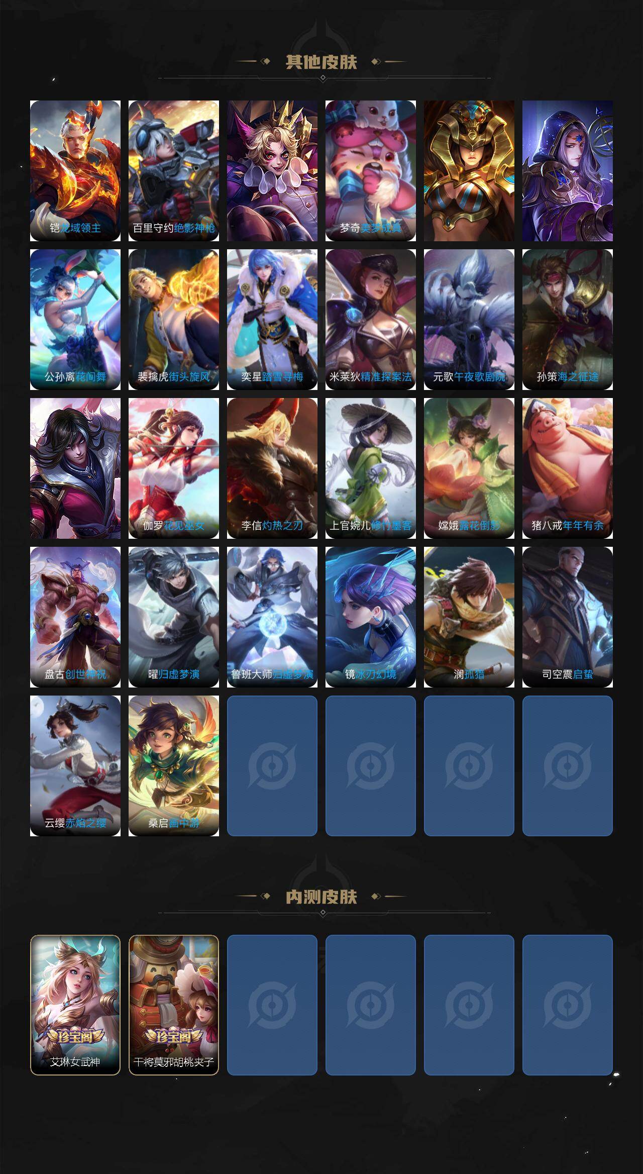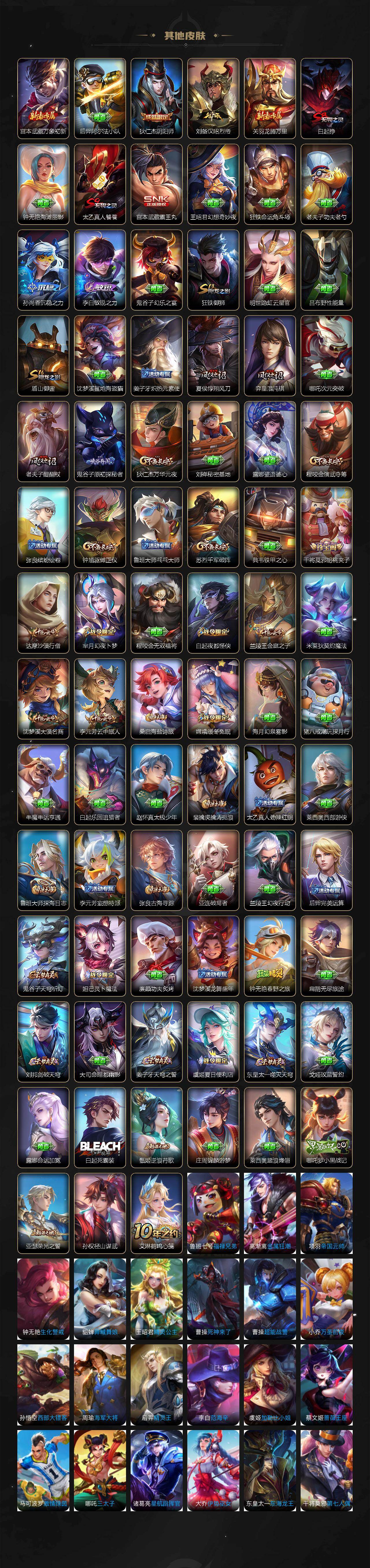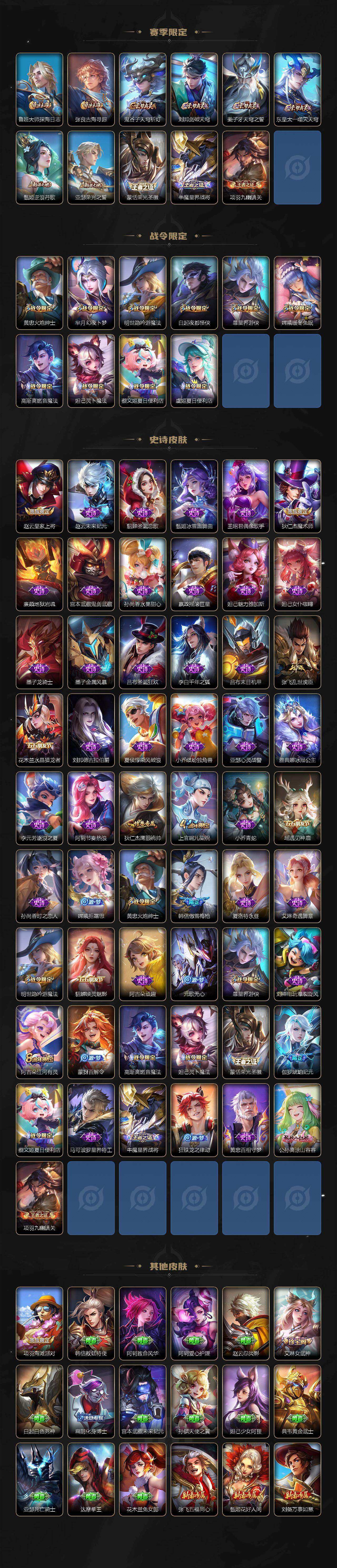 【限定皮肤】:白起狰,蔡文姬夏日便利店,虞姬夏日便利店,姜子牙天穹之誓,狄仁杰阴阳师,赵云皇家上将,孙尚香异界灵契,白起夜都怪侠,芈月幻夜卜梦,元歌无心,夏侯惇朔风刀,狄仁杰魔术师,狄仁杰万华元夜,达摩沙漠行僧,项羽海滩派对,老夫子醍醐杖,程咬金演武夺筹,露娜启示之音,韩信傲雪梅枪,兰陵王金庭之子,孙悟空零号赤焰,孙悟空齐天大圣,李元芳云中旅人,钟馗驱傩正仪,干将莫邪胡桃夹子,太乙真人饕餮,鬼谷子原初探秘者,诸葛亮武陵仙君,黄忠火炮绅士,苏烈千军破阵,弈星混沌棋,沈梦溪大漠名商,明世隐吟游魔法,裴擒虎擒涛扼浪,狂铁御狮,盾山御銮,上官婉儿梁祝,嫦娥拒霜思,嫦娥暖冬兔眠,鲁班大师探海日志,桑启海盐诗旅,暃星界游侠,艾琳女武神,阿古朵江河有灵,张良古海寻踪,狄仁杰夜礼服假面,蒙犽百解令,蒙恬荣光圣徽,高渐离燃音魔法,妲己灵卜魔法,鬼谷子天穹祈灯,伽罗琥珀纪元,孙尚香乘龙问璇玑,沈梦溪龙舞盛年,刘邦剑破天穹