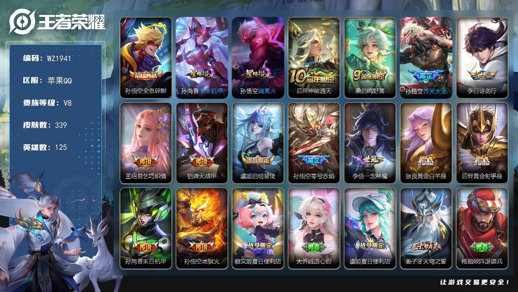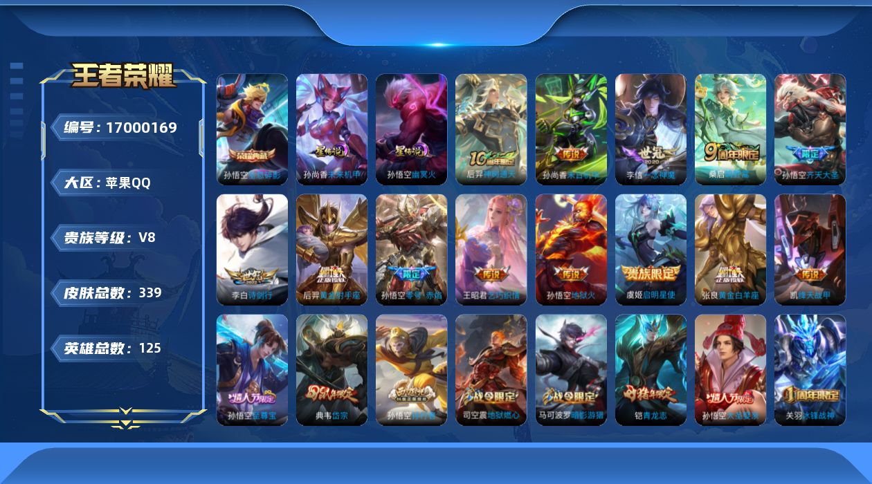 [17000169]苹果Q-339皮肤-1典藏皮肤-13传说-98史诗 【英雄全皮】:刘邦全皮 【荣耀典藏】:孙悟空全息碎影 【传说皮肤】:后羿神树通天,桑启鸣野蒿,孙悟空齐天大圣,李白诗剑行,王昭君乞巧织情,铠绛天战甲,虞姬启明星使,孙悟空零号赤焰,李信一念神魔,张良黄金白羊座,后羿黄金射手座,孙尚香末日机甲,孙悟空地狱火 【限定皮肤】:蔡文姬夏日便利店,大乔绒语心约,虞姬夏日便利店,姜子牙天穹之誓,杨戬破阵退雄兵,狄仁杰阴阳师,赵云皇家上将,赵云龙胆,墨子神迹守卫,孙尚香蔷薇恋人,鲁班七号狮舞东方,庄周高山流水,高渐离玩趣恶龙,阿轲迷踪丽影,钟无艳王者之锤,钟无艳超时空战士,扁鹊奇幻香踪,吕布御风骁将,周瑜赤莲之焰,元歌云间偶戏,元歌无心,夏侯惇朔风刀,甄姬游园惊梦,甄姬落雪兰心,典韦穷奇,典韦岱宗,马可波罗暗影游猎,狄仁杰魔术师,狄仁杰万华元夜,达摩星际陆战队,达摩沙漠行僧,项羽海滩派对,老夫子醍醐杖,老夫子航海奇遇记,关羽冰锋战神,程咬金演武夺筹,刘邦夺宝奇兵,韩信飞衡,韩信傲雪梅枪,王昭君午后时光,兰陵王驯魔猎人,兰陵王金庭之子,花木兰默契交锋,亚瑟潮玩骑士王,孙悟空美猴王,孙悟空至尊宝,孙悟空大圣娶亲,孙悟空零号赤焰,孙悟空孙行者,孙悟空齐天大圣,牛魔御旌,后羿圣弓游侠,李元芳银河之约,李元芳云中旅人,虞姬启明星使,钟馗神迹守卫,钟馗驱傩正仪,杨玉环遇见飞天,杨戬潮玩骑兵,雅典娜单词大作战,雅典娜黎明之约,蔡文姬繁星吟游,太乙真人华丽摇滚,鬼谷子原初探秘者,鬼谷子五谷丰年,铠青龙志,苏烈玄武志,苏烈千军破阵,百里玄策原初追逐者,百里守约朱雀志,弈星混沌棋,梦奇顽趣,沈梦溪星空之诺,沈梦溪大漠名商,明世隐疑决卦,裴擒虎李小龙,裴擒虎擒涛扼浪,狂铁御狮,狂铁电玩高手,米莱狄御霄,米莱狄胡桃异想国,云中君纤云弄巧,盾山御銮,猪八戒西部大镖客,上官婉儿神器万象笔,嫦娥拒霜思,嫦娥暖冬兔眠,西施玲珑珍味,蒙犽狂想玩偶喵,鲁班大师探海日志,桑启海盐诗旅,暃星界游侠,戈娅驭风魔法,艾琳流音漫舞,司空震地狱燃心,阿古朵江河有灵,张良古海寻踪,蒙犽百解令,蒙恬荣光圣徽,鬼谷子天穹祈灯,刘邦剑破天穹,程咬金群星魔术团,镜青焰无极,项羽苍威无极,刘备异域游侠,芈月浮光幕影,周瑜熔金海岸 【年限皮肤】:孙悟空美猴王,苏烈玄武志,百里守约朱雀志,铠青龙志,典韦岱宗,韩信飞衡,吕布御风骁将 【赛季限
