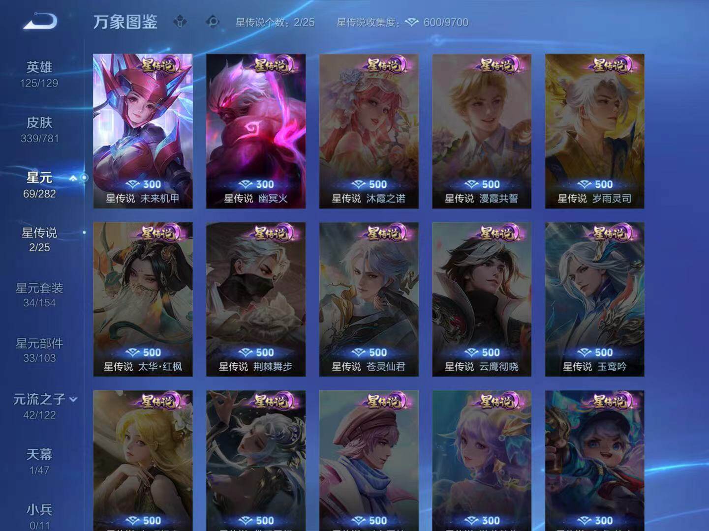 典韦穷奇,狂铁御狮,米莱狄御霄,牛魔御旌,盾山御銮,夏侯惇朔风刀,明世隐疑决卦,老夫子醍醐杖,鬼谷子原初探秘者,狄仁杰万华元夜,程咬金演武夺筹,钟馗驱傩正仪,苏烈千军破阵,钟馗神迹守卫,鲁班七号狮舞东方,沈梦溪星空之诺,李元芳银河之约,刘邦夺宝奇兵,马可波罗暗影游猎,蒙犽狂想玩偶喵,元歌云间偶戏,弈星混沌棋,达摩沙漠行僧,兰陵王金庭之子,沈梦溪大漠名商,李元芳云中旅人,桑启海盐诗旅,裴擒虎擒涛扼浪,鲁班大师探海日志,张良古海寻踪,项羽苍威无极,镜青焰无极
