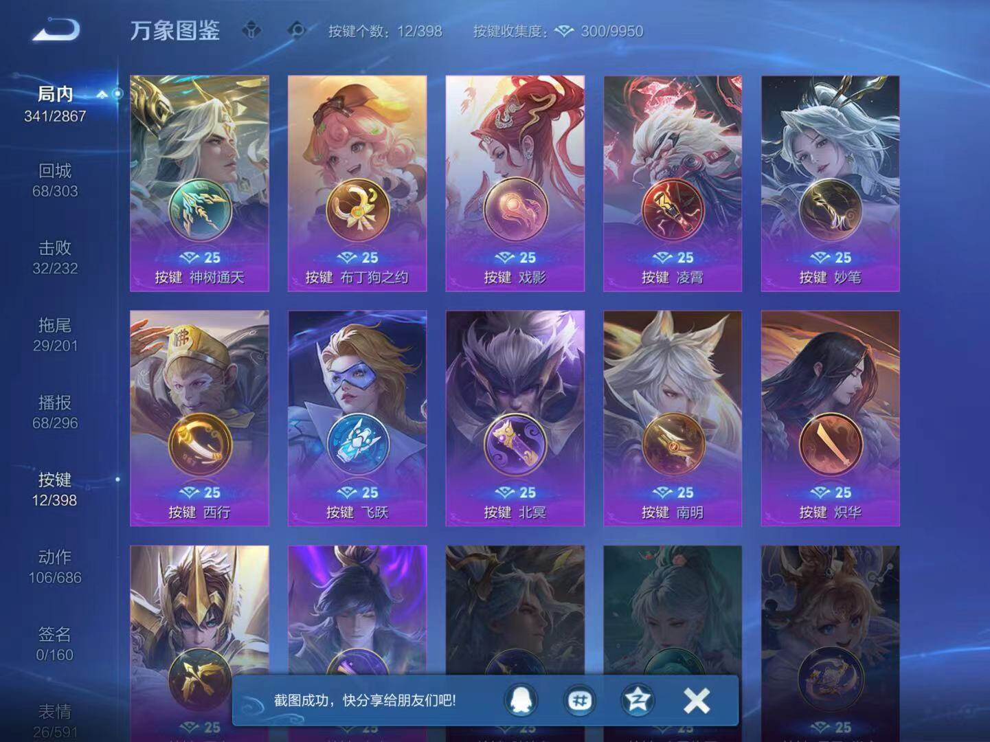 关羽冰锋战神,裴擒虎李小龙,吕布御风骁将,赵云龙胆,典韦岱宗,韩信飞衡,铠青龙志,苏烈玄武志,百里守约朱雀志,孙悟空大圣娶亲,花木兰默契交锋,孙悟空至尊宝,孙悟空美猴王,孙悟空孙行者,韩信傲雪梅枪,上官婉儿神器·万象笔,李白诗剑行,桑启鸣野蒿