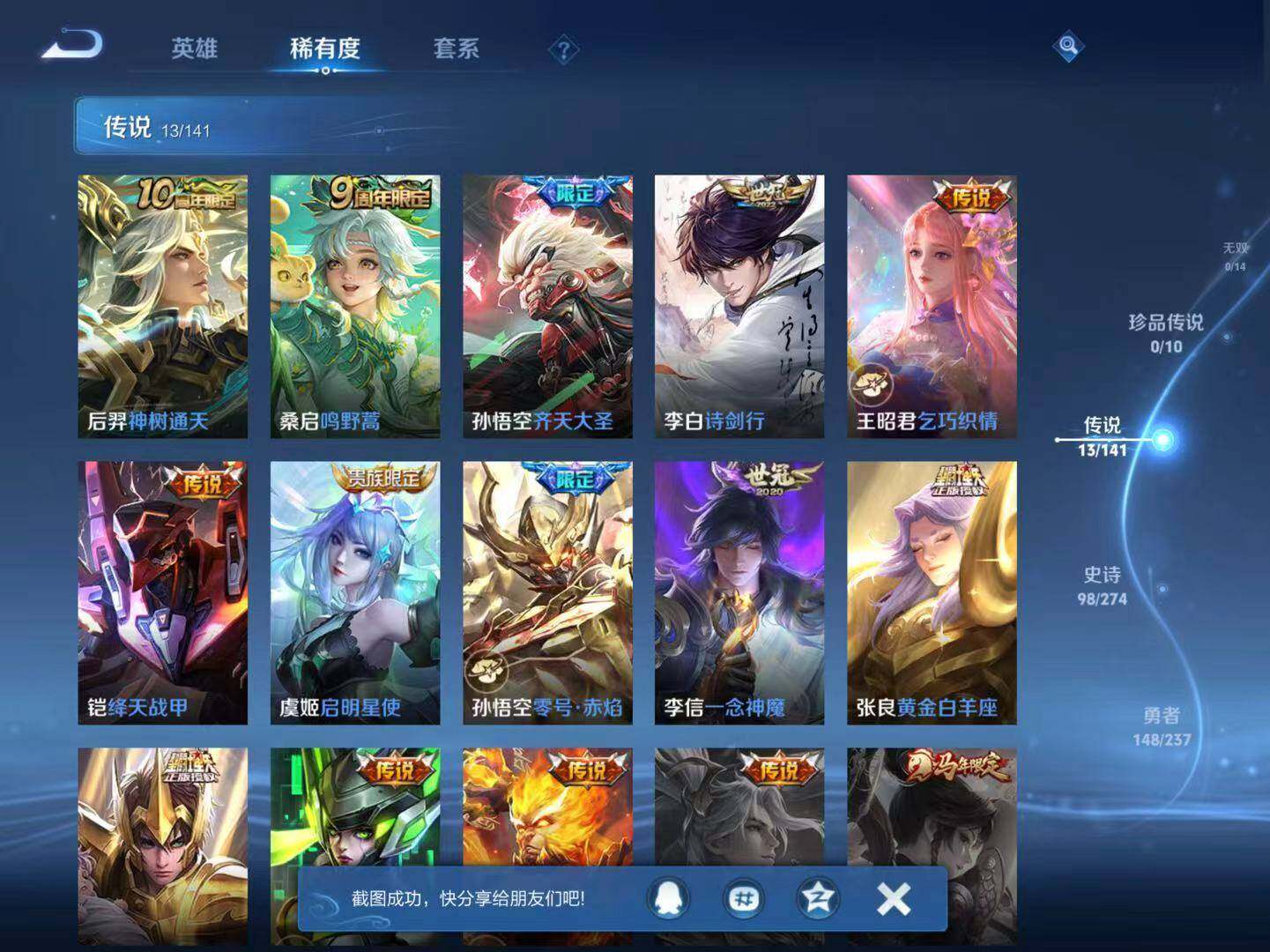 【传说皮肤】:后羿神树通天,桑启鸣野蒿,孙悟空齐天大圣,李白诗剑行,王昭君乞巧织情,铠绛天战甲,虞姬启明星使,孙悟空零号赤焰,李信一念神魔,张良黄金白羊座,后羿黄金射手座,孙尚香末日机甲,孙悟空地狱火