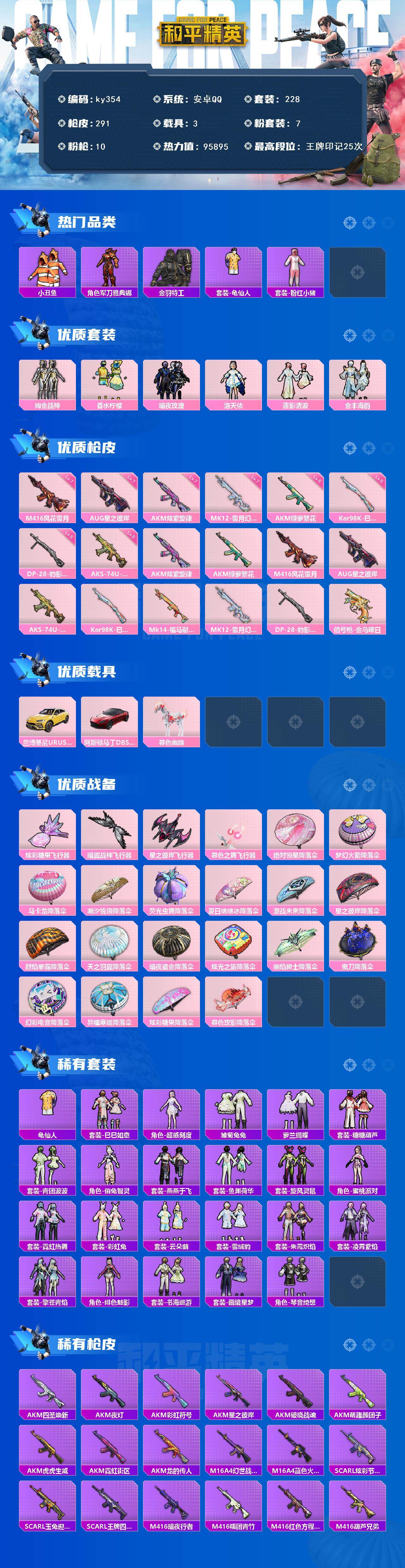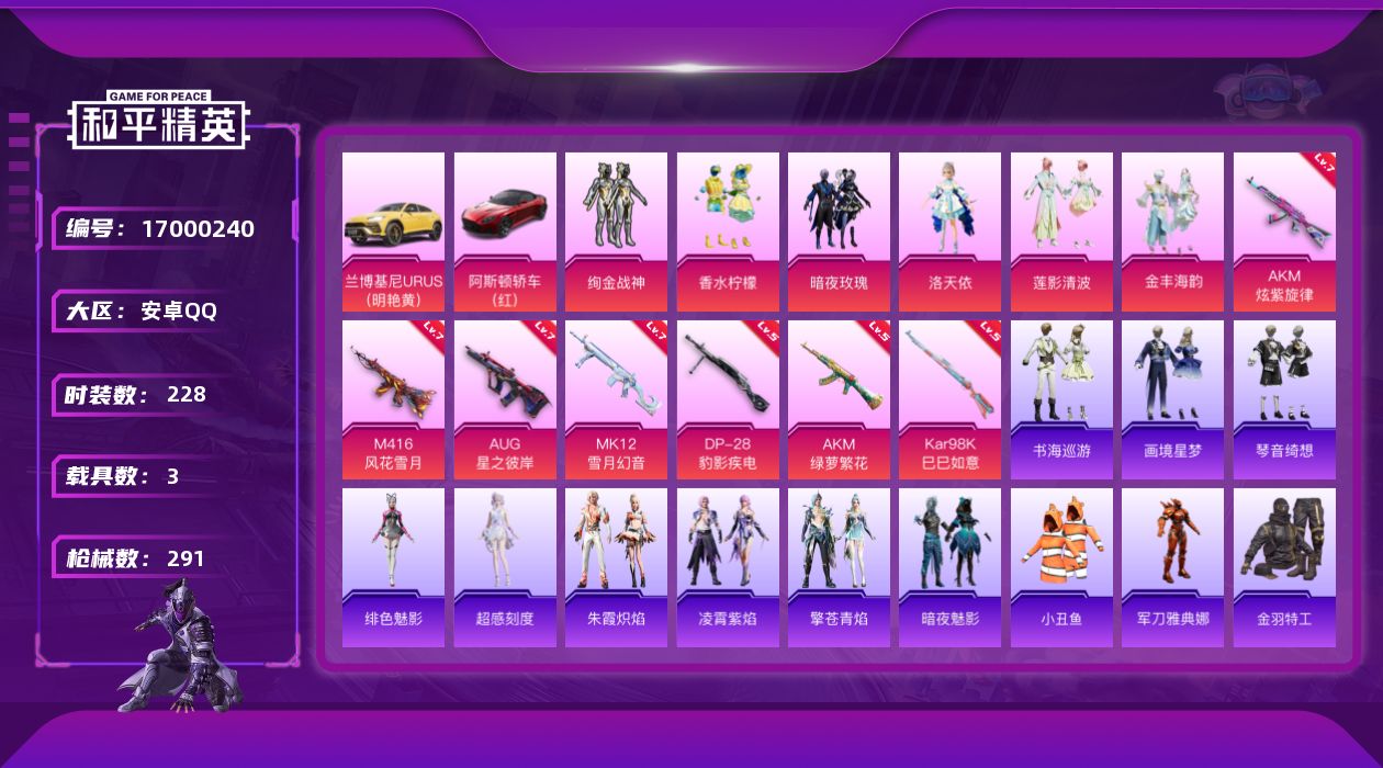 [17000240]安卓 手Q-7粉装-10特效枪-3载具-4粉色飞行器-95895热力值-25王牌印记-228套装-291枪皮 【热门品类】:套装-小丑鱼,角色-军刀雅典娜,套装-金羽特工,套装-龟仙人,套装-粉红小猪 【粉色套装】:粉装-绚金战神,粉装-香水柠檬,粉装-暗夜玫瑰,角色-洛天依,粉装-莲影清波,粉装-金丰海韵 【粉色枪皮等级】:AKM-炫紫旋律(七级),AKM-绿萝繁花(五级),M416-风花雪月(七级),AUG-星之彼岸(七级),AKS-74U-森灵之息(五级),Kar98K-巳巳如意(五级),MK12-雪月幻音(七级),DP-28-豹影疾电(五级) 【粉色载具】:兰博基尼URUS(明艳黄),阿斯顿马丁DBS(红),暮色幽蹄 【粉色枪皮】:AKM-炫紫旋律,AKM-绿萝繁花,M416-风花雪月,AUG-星之彼岸,AKS-74U-森灵之息,Kar98K-巳巳如意,Mk14-福马献瑞,MK12-雪月幻音,DP-28-豹影疾电,信号枪-金乌曜日 【粉色飞行器】:炫彩糖果飞行器,暗翼战神飞行器,星之彼岸飞行器,暮色之舞飞行器 【粉色降落伞】:绝对恒星降落伞,梦幻火箭降落伞,马卡龙降落伞,潮汐统领降落伞,荧光虫舞降落伞,夏日绵绵冰降落伞,激战未来降落伞,星之彼岸降落伞,烈焰拳霸降落伞,天之羽翼降落伞,暗夜鎏金降落伞,炫光之旅降落伞,幽焰骑士降落伞,鬼刀降落伞,幻彩电音降落伞,异瞳寒姬降落伞,炫彩糖果降落伞,暮色玫影降落伞 【稀有套装】:套装-龟仙人,套装-巳巳如意,角色-超感刻度,套装-雪国风尚,套装-炫彩糖果,套装-雏菊兔兔,套装-萝兰蝴蝶,套装-糖糖葫芦,套装-青团波波,角色-俏兔智灵,套装-燕燕于飞,套装-鱼渊荷华,套装-旋风灵鼠,角色-蜜桃派对,套装-霓虹热舞,套装-彩虹兔,套装-云朵鹅,套装-雪绒豹,套装-朱霞炽焰,套装-凌霄紫焰,套装-擎苍青焰,角色-绯色魅影,套装-书海巡游,套装-画境星梦,套装-琴音绮想 【稀有枪皮】:AUG-冰晶雪宝,AKM-四圣焕新,AKM-夜灯,AKM-彩虹符号,AKM-星之彼岸,AKM-破晓战魂,AKM-萌趣颜团子,AKM-虎虎生威,AKM-霓虹街区,AKM-龙的传人,M16A4-幻世战舞者,M16A4-蓝色火焰,SCAR-L-炫彩节奏,SCAR-L-玉兔迎春,SCAR-L-王牌四分卫,M416-暗夜行者,M416-糯团青竹,M416