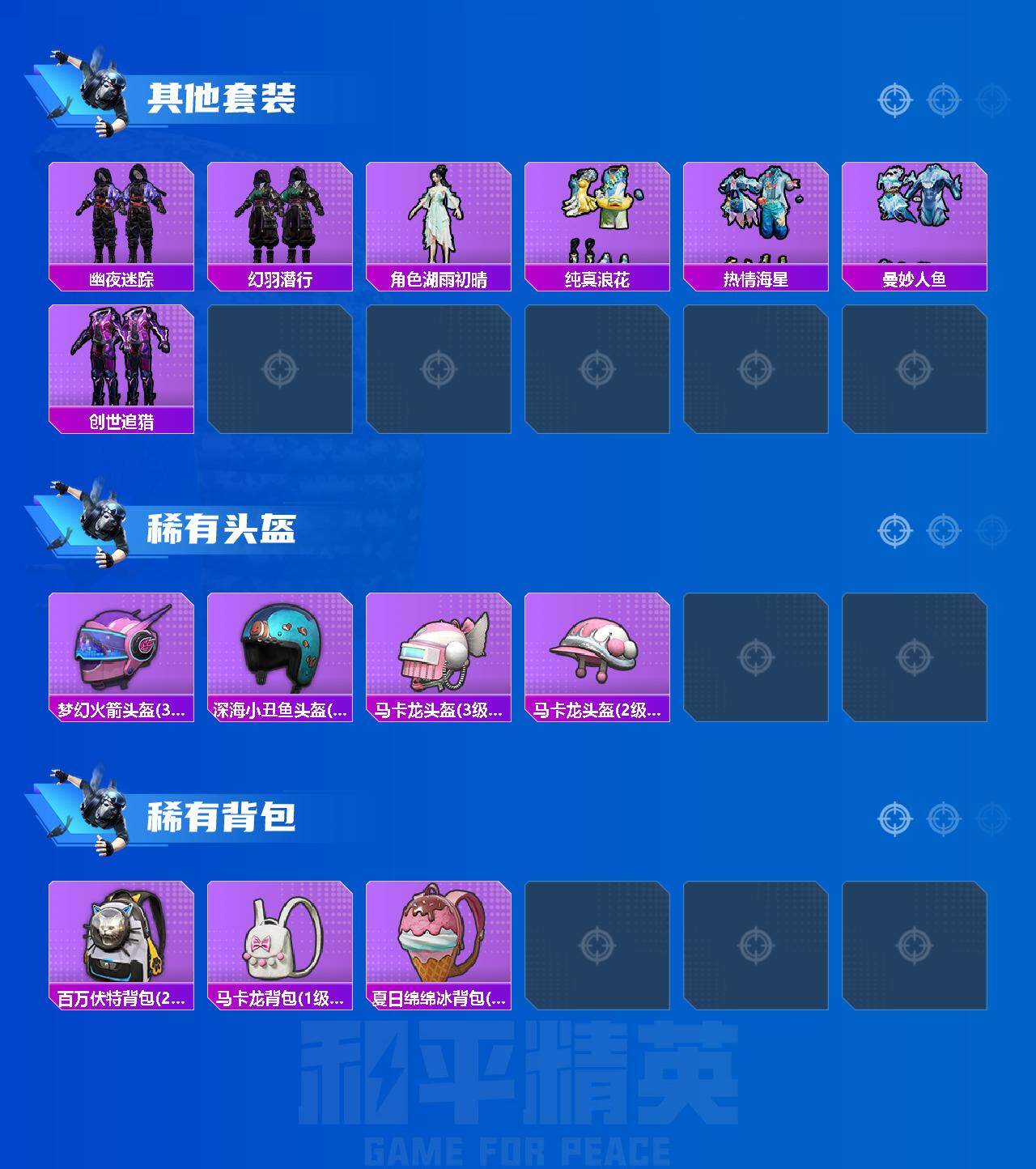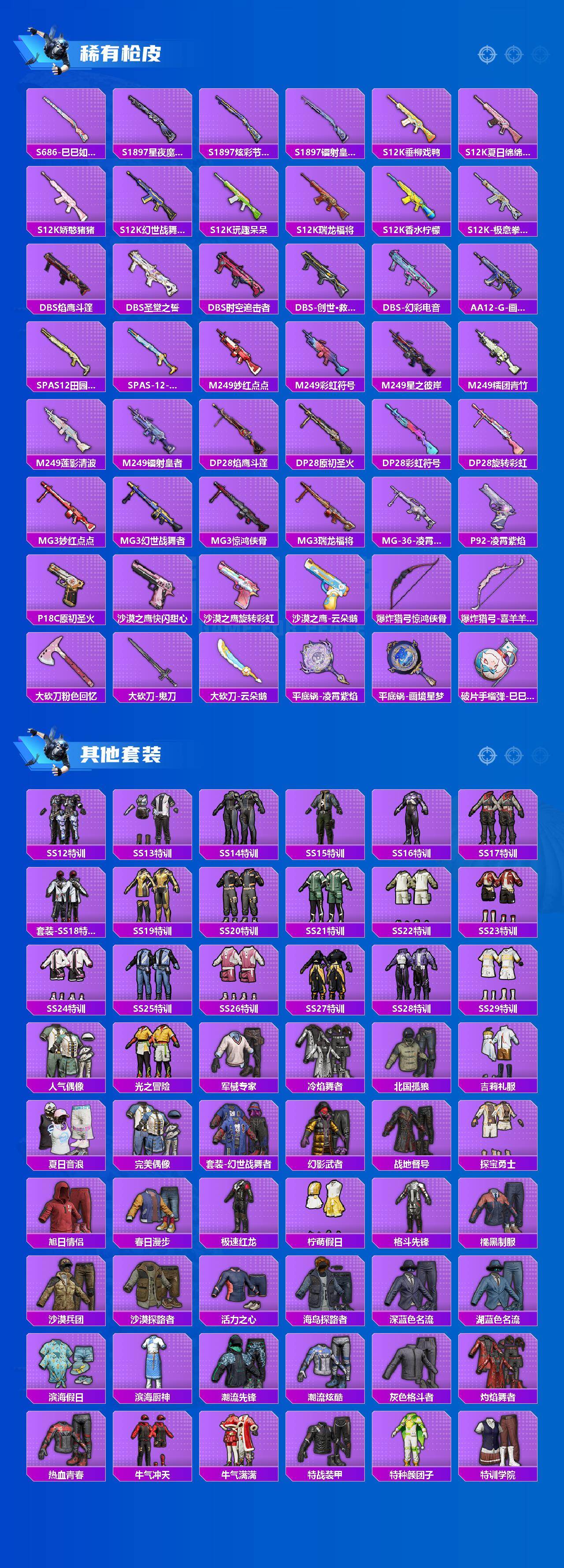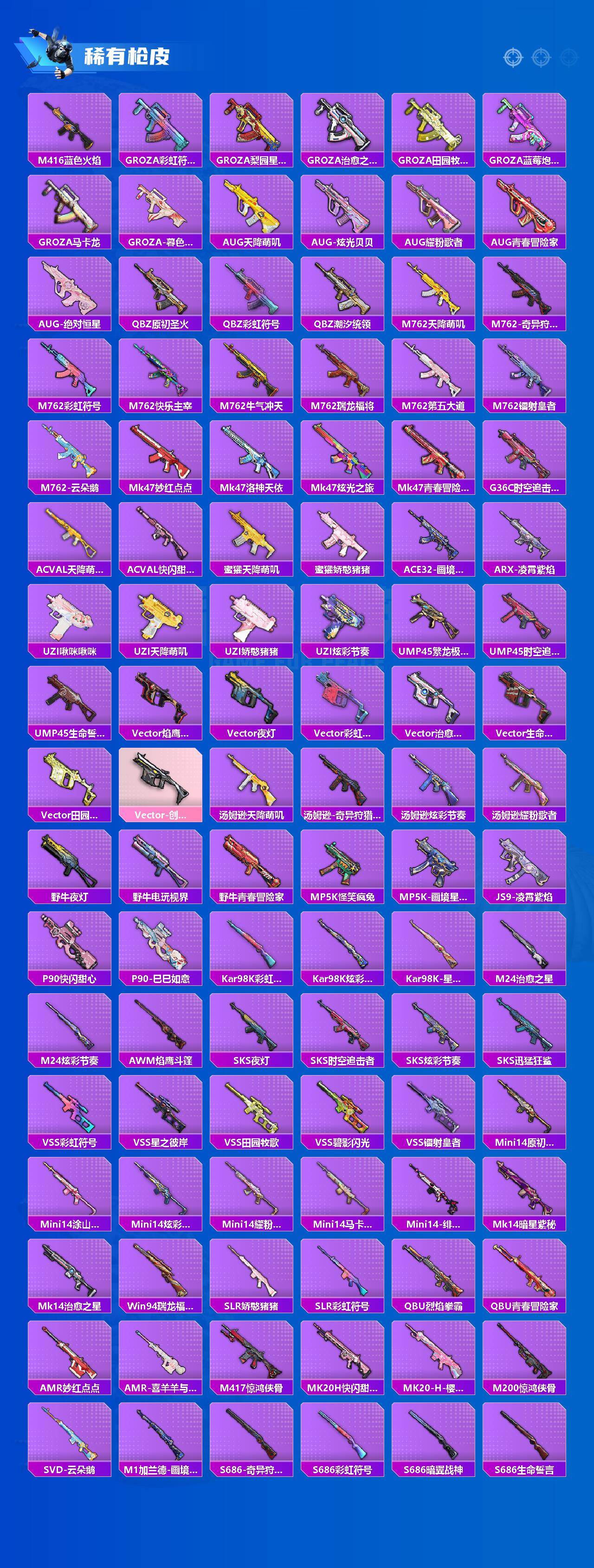 【稀有枪皮】:AUG-冰晶雪宝,AKM-四圣焕新,AKM-夜灯,AKM-彩虹符号,AKM-星之彼岸,AKM-破晓战魂,AKM-萌趣颜团子,AKM-虎虎生威,AKM-霓虹街区,AKM-龙的传人,M16A4-幻世战舞者,M16A4-蓝色火焰,SCAR-L-炫彩节奏,SCAR-L-玉兔迎春,SCAR-L-王牌四分卫,M416-暗夜行者,M416-糯团青竹,M416