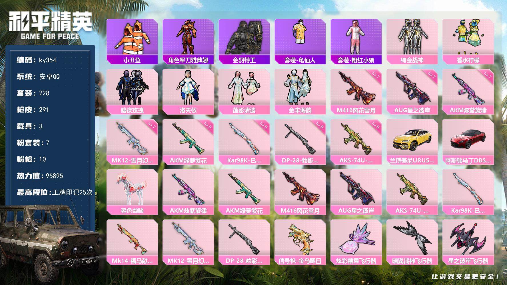 [17000240]安卓 手Q-7粉装-10特效枪-3载具-4粉色飞行器-95895热力值-25王牌印记-228套装-291枪皮