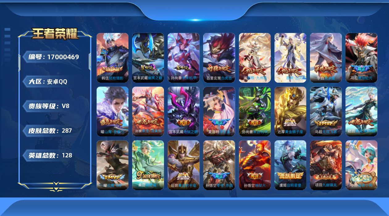 - [11780250]【商品标题】:安卓Q-V8-至尊星耀I段位-124英雄-319皮肤-2典藏-0珍品无双-0无双-0珍品传说-17传说-90史诗 【荣耀典藏】:孙悟空全息碎影,李白鸣剑曳影 【内测皮肤】:嬴政优雅恋人,高渐离玩趣恶龙,狂铁特工战影 【传说皮肤】:狄仁杰超时空战士,孙悟空地狱火,宫本武藏地狱之眼,貂蝉仲夏夜之梦,后羿黄金射手座,达摩黄金狮子座,伽罗太华,曜云鹰飞将,虞姬启明星使,镜炽阳神光,李白诗剑行,李信山海炽霜斩,曜山海苍雷引,孙悟空齐天大圣,桑启鸣野蒿,裴擒虎祥瑞亨通,司空震愿照山河定 【限定皮肤】:白起狰,姜子牙天穹之誓,狄仁杰阴阳师,赵云皇家上将,墨子神迹守卫,嬴政优雅恋人,鲁班七号狮舞东方,庄周高山流水,高渐离死亡摇滚,高渐离玩趣恶龙,钟无艳王者之锤,周瑜赤莲之焰,元歌无心,夏侯惇朔风刀,甄姬游园惊梦,曹操烛龙,典韦穷奇,典韦岱宗,马可波罗暗影游猎,马可波罗山海玄木吟,狄仁杰魔术师,狄仁杰万华元夜,达摩沙漠行僧,项羽海滩派对,老夫子醍醐杖,老夫子航海奇遇记,程咬金演武夺筹,韩信飞衡,王昭君午后时光,兰陵王驯魔猎人,兰陵王金庭之子,孙悟空孙行者,孙悟空齐天大圣,牛魔御旌,后羿如梦令,后羿圣弓游侠,李元芳云中旅人,虞姬启明星使,钟馗神迹守卫,钟馗驱傩正仪,杨玉环遇见飞天,干将莫邪真爱魔法,雅典娜黎明之约,蔡文姬繁星吟游,太乙真人饕餮,太乙真人华丽摇滚,鬼谷子原初探秘者,鬼谷子五谷丰年,黄忠烈魂,苏烈千军破阵,百里玄策原初追逐者,弈星混沌棋,梦奇顽趣,沈梦溪大漠名商,裴擒虎李小龙,裴擒虎擒涛扼浪,狂铁御狮,狂铁电玩高手,李信山海炽霜斩,伽罗太华,盾山御銮,猪八戒西部大镖客,上官婉儿梁祝,嫦娥拒霜思,嫦娥暖冬兔眠,曜山海苍雷引,鲁班大师探海日志,桑启海盐诗旅,暃星界游侠,艾琳流音漫舞,司空震地狱燃心,阿古朵江河有灵,张良古海寻踪,蒙犽百解令,蒙恬荣光圣徽,鬼谷子天穹祈灯,姬小满妄想食味,刘邦剑破天穹,程咬金群星魔术团,周瑜熔金海岸 【年限皮肤】:伽罗太华,韩信飞衡,典韦岱宗,马超神威,黄忠烈魂,马可波罗山海玄木吟,李信山海炽霜斩,曜山海苍雷引 【赛季限定】:白起狰,夏侯惇朔风刀,曹操烛龙,典韦穷奇,狄仁杰万华元夜,达摩沙漠行僧,老夫子醍醐杖,程咬金演武夺筹,兰陵王金庭之子,张良古海寻踪,牛魔御旌,李元芳云中旅人,钟馗驱傩正仪,雅典娜黎明之约,太乙真人饕餮,鬼谷子原