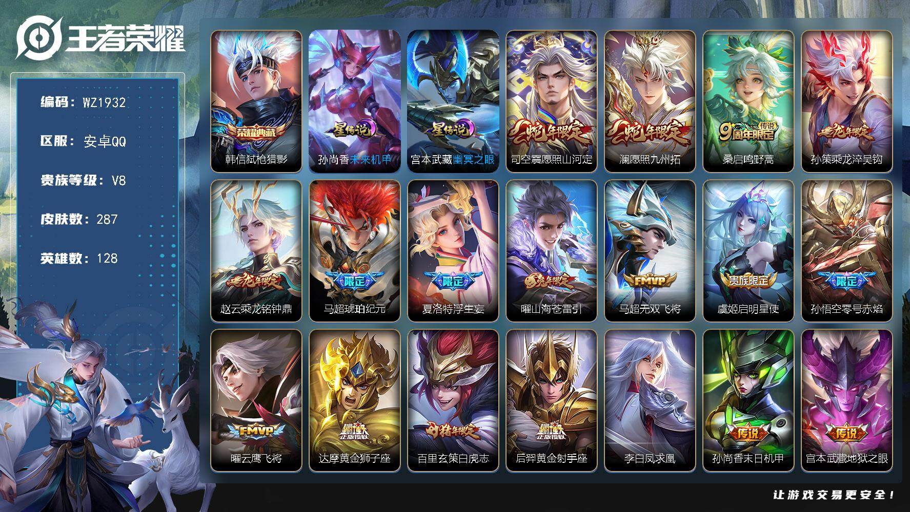 - [14740499]可二次【店主推荐捡漏号!可直接换绑】,安卓Q-V5-至尊星耀V段位-125英雄-167皮肤-6传说-45史诗 【传说皮肤】:后羿神树通天,桑启鸣野蒿,不知火舞绯月行,马可波罗深海之息,孙尚香末日机甲,宫本武藏地狱之眼 【限定皮肤】:白起狰,狄仁杰阴阳师,赵云皇家上将,孙尚香蔷薇恋人,高渐离死亡摇滚,钟无艳超时空战士,吕布猎兽之王,元歌云间偶戏,元歌无心,夏侯惇朔风刀,甄姬落雪兰心,典韦穷奇,马可波罗暗影游猎,马可波罗深海之息,狄仁杰魔术师,狄仁杰万华元夜,达摩沙漠行僧,项羽海滩派对,老夫子醍醐杖,程咬金演武夺筹,韩信飞衡,王昭君午后时光,兰陵王金庭之子,不知火舞绯月行,亚瑟潮玩骑士王,孙悟空至尊宝,牛魔御旌,李元芳银河之约,李元芳云中旅人,钟馗驱傩正仪,雅典娜黎明之约,蔡文姬繁星吟游,太乙真人华丽摇滚,鬼谷子原初探秘者,鬼谷子五谷丰年,苏烈千军破阵,百里玄策原初追逐者,百里守约朱雀志,弈星混沌棋,沈梦溪星空之诺,沈梦溪大漠名商,明世隐疑决卦,裴擒虎李小龙,裴擒虎擒涛扼浪,狂铁御狮,狂铁电玩高手,米莱狄御霄,盾山御銮,猪八戒西部大镖客,上官婉儿梁祝,嫦娥拒霜思,鲁班大师探海日志,桑启海盐诗旅,张良古海寻踪,刘邦剑破天穹 【年限皮肤】:百里守约朱雀志,韩信飞衡 【赛季限定】:白起狰,夏侯惇朔风刀,典韦穷奇,狄仁杰万华元夜,达摩沙漠行僧,老夫子醍醐杖,程咬金演武夺筹,兰陵王金庭之子,张良古海寻踪,牛魔御旌,李元芳云中旅人,钟馗驱傩正仪,雅典娜黎明之约,鬼谷子原初探秘者,苏烈千军破阵,百里玄策原初追逐者,弈星混沌棋,沈梦溪大漠名商,明世隐疑决卦,裴擒虎擒涛扼浪,狂铁御狮,米莱狄御霄,盾山御銮,鲁班大师探海日志,桑启海盐诗旅,刘邦剑破天穹 【战令限定】:钟无艳超时空战士,吕布猎兽之王,元歌云间偶戏,甄姬落雪兰心,马可波罗暗影游猎,王昭君午后时光,亚瑟潮玩骑士王,李元芳银河之约,沈梦溪星空之诺,狂铁电玩高手,猪八戒西部大镖客 【史诗皮肤】:鲁班七号电玩小子,露娜紫霞仙子,赵云嘻哈天王,赵云皇家上将,赵云未来纪元,貂蝉圣诞恋歌,甄姬冰雪圆舞曲,王昭君偶像歌手,狄仁杰魔术师,孙尚香蔷薇恋人,孙尚香水果甜心,墨子金属风暴,吕布圣诞狂欢,李白千年之狐,张飞乱世虎臣,韩信白龙吟,孙悟空至尊宝,诸葛亮黄金分割率,亚瑟心灵战警,雅典娜冰冠公主,百里守约特工魅影,蔡文姬舞动绿茵,刘禅天才门将