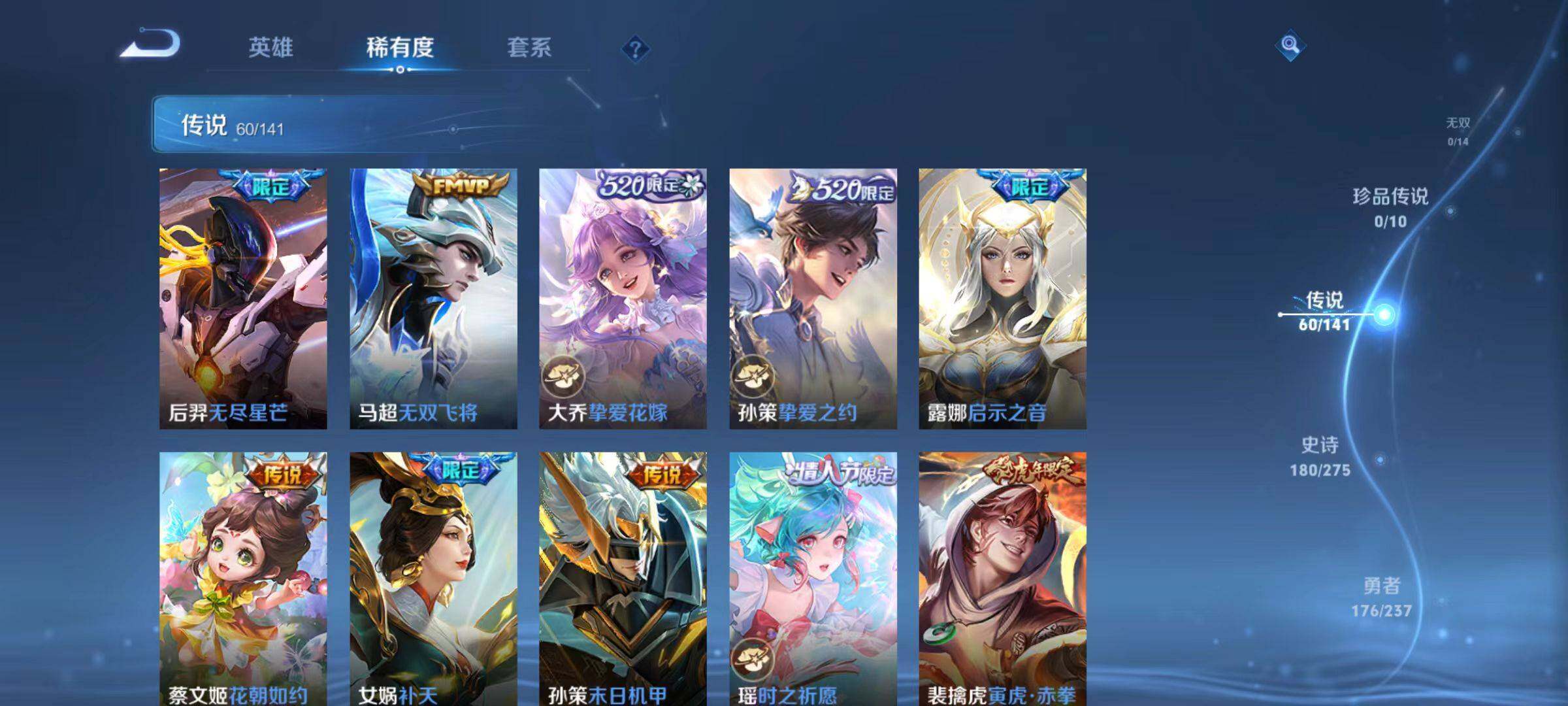 【传说皮肤】:桑启鸣野蒿,艾琳觅芳踪,亚瑟追逃游戏,夏洛特浮生妄,伽罗炽翼辉光,孙悟空齐天大圣,小乔山海琳琅生,曜山海苍雷引,李信山海炽霜斩,吕布怒海麟威,后羿无尽星芒,马超无双飞将,大乔挚爱花嫁,孙策挚爱之约,露娜启示之音,蔡文姬花朝如约,女娲补天,孙策末日机甲,瑶时之祈愿,裴擒虎寅虎赤拳,鲁班七号寅虎瑞焰,孙尚香异界灵契,貂蝉遇见胡旋,赵云淬星耀世,王昭君乞巧织情,西施游龙清影,曜李逍遥 ,周瑜音你心动,小乔音你心动,李元芳飞鸢探春,兰陵王默契交锋,公孙离祈雪灵祝,诸葛亮时雨天司,铠绛天战甲,镜炽阳神光,虞姬启明星使,孙悟空零号赤焰,关羽武圣,曜云鹰飞将,李信一念神魔,刘备时之恋人,伽罗太华,貂蝉猫影幻舞,张良黄金白羊座,干将莫邪久胜战神,虞姬云霓雀翎,达摩黄金狮子座,百里玄策白虎志,花木兰冠军飞将,梦奇胖达荣荣,后羿黄金射手座,杨戬永曜之星,诸葛亮武陵仙君,李白凤求凰,孙尚香末日机甲,宫本武藏地狱之眼,孙悟空地狱火,吕布天魔缭乱,武则天海洋之心,狄仁杰超时空战士