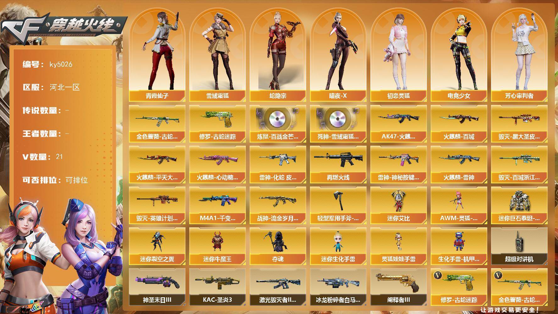 [17002228]河北一区-21V-0王者-0炫金 【热门武器】:金色蔷薇-古蛇迷踪,修罗-古蛇迷踪 【音效卡】:炼狱-百战金芒-庆典舞曲音效卡,死神-雪域霜狐-怀旧音效卡 【皮肤】:雷神-化蛇 皮肤,M4A1-再燃火线,雷神-神秘按键 皮肤,火麒麟-雷神,AK47-火麒麟-传奇EVEN,火麒麟-平天大圣,火麒麟-百城,火麒麟-心动糖果,毁灭-黑大圣皮肤,毁灭-百城浙江 皮肤,毁灭-英雄计划 皮肤,M4A1-千变-孔明皮肤*2,战神-流金岁月皮肤,轻型军用手斧-再燃火线 【角色】:雪域霜狐,蛇隐宗,暗夜-X,初恋灵狐,电竞少女,芳心审判者,风暴女,嘉年华灵狐,娟娟,0号玩家,灵狐-花神,灵狐者-X,灵狐者-黄金海岸,灵狐者-七夕宝贝,麻雀,曼陀罗-礼服,玫瑰花神,潘多拉-X,潘多拉-甜心教官,潜龙队-X,邱刚敖,青霞仙子,蛇姬,斯沃特-X,兔囡囡,新娜塔莎,夜玫瑰-幻能朋克,樱-战斗天使,影武者-X,游珑儿 【人偶武器】:AWM-灵狐-15周年嘉年华,迷你裂空之翼*3,迷你牛魔王,夺魂,迷你生化手雷,生化手雷-机甲核心,迷你艾比,迷你巨石泰坦-魔花研究所,灵狐娃娃手雷 【暴走生化】:超级对讲机 【挑战大师】:冰龙粉碎者-白马银枪*2,激光毁灭者III-白马银枪*3,KAC-圣炎切割者III,神圣爆裂者-末日III*3,阐释者III 【英雄级武器】:AK47-火麒麟*2,M4A1-黑龙,黑武士-锦绣游龙,金色蔷薇-古蛇迷踪,死神-雪域霜狐,黑骑士-海王*4,Barrett-毁灭,炼狱-百战金芒,修罗-古蛇迷踪,幻灵之锋,麒麟刺-百战金芒,高爆手雷-古蛇迷踪,烟雾弹-古蛇迷踪,M4A1-赤狱骑士 【道具】:BS战队炫彩背包,CFS限定背包,XROCK炫彩背包,云山科技背包,亚洲杯纪念炫彩背包,古蛇迷踪炫彩背包,百战金芒炫彩背包,背包-洛丽塔,超级背包,雪域霜狐炫彩背包,救世主-黑桃战神,妩媚妖姬,黄金生化钩,绿色巨人,灵魂忍者*2,变异宝贝,迷雾幽灵*3,生化弹匣,夺命之镰,防化服*3,金色流光-枪王排位,星辰流光-枪王排位,枪王排位28赛季金色流光,语音特效-盛典烟火,语音特效-怀旧,古蛇迷踪打击特效,雪域霜狐表情,蛇隐宗表情,萌萌小葵表情,EP战队名片,EP战队喷图,EP战队击杀图标,防弹头盔*6,防弹衣*5,C4工具钳*4,手雷包*4 【特殊枪械】: