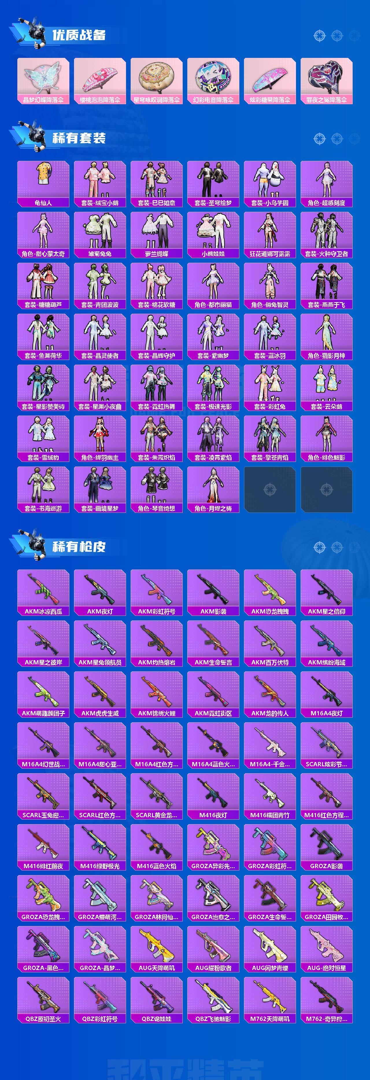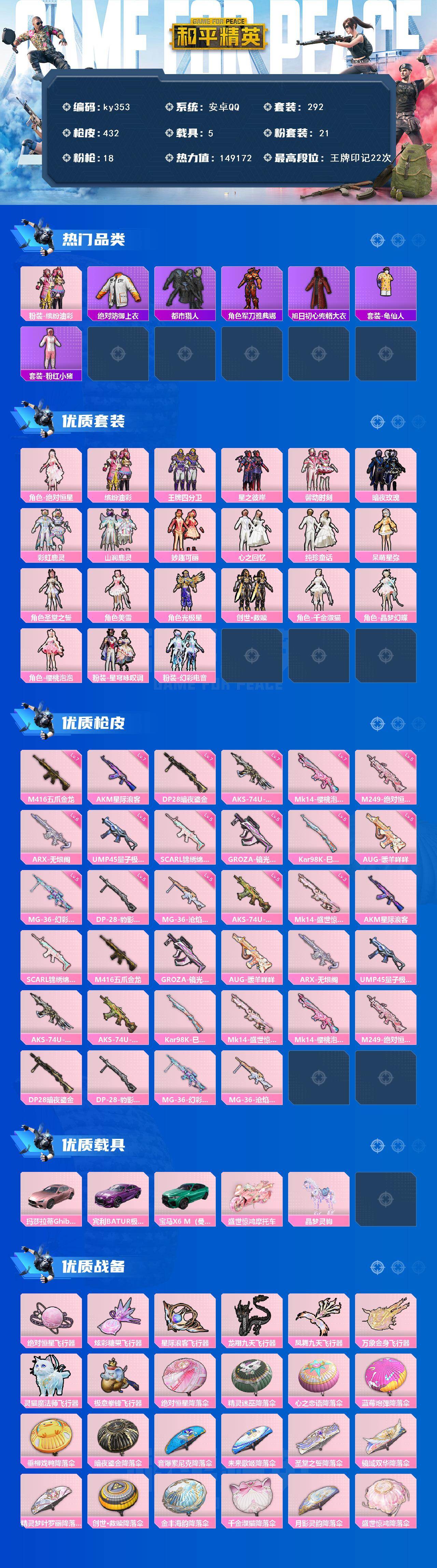 [17002480]安卓 手Q-21粉装-18特效枪-5载具-8粉色飞行器-149172热力值-22王牌印记-292套装-432枪皮 【热门品类】:粉装-缤纷油彩,绝对防御上衣,套装-都市猎人,角色-军刀雅典娜,旭日初心兜帽大衣,套装-龟仙人,套装-粉红小猪 【粉色套装】:角色-绝对恒星,粉装-缤纷油彩,粉装-王牌四分卫,粉装-星之彼岸,粉装-馨动时刻,粉装-暗夜玫瑰,粉装-彩虹鹿灵,粉装-山涧鹿灵,粉装-妙趣可丽,粉装-心之回忆,粉装-纯珍童话,角色-呆萌星弥,角色-圣堂之誓,角色-美雪,角色-光极星,套装-创世·救赎,角色-千金淑猫,角色-晶梦幻蝶,角色-樱桃泡泡,粉装-星穹咏叹调,粉装-幻彩电音 【粉色枪皮等级】:AKM-星际浪客(七级),SCAR-L-锦绣绵绵(五级),M416-五爪金龙(七级),GROZA-镜光银凌(五级),AUG-暖羊咩咩(五级),ARX-无垠阁(六级),UMP45-量子极限(五级),AKS-74U-信仰神谕(七级),AKS-74U-森灵之息(五级),Kar98K-巳巳如意(五级),Mk14-盛世惊鸿(三级),Mk14-樱桃泡泡(七级),M249-绝对恒星(五级),DP-28-暗夜鎏金(七级),DP-28-豹影疾电(五级),MG-36-幻彩电音(五级),MG-36-沧焰双生(五级) 【粉色载具】:玛莎拉蒂Ghibli(粉),宾利BATUR(极速紫),宝马X6 M(曼岛绿),盛世惊鸿摩托车,晶梦灵驹 【粉色枪皮】:AKM-星际浪客,SCAR-L-锦绣绵绵,M416-五爪金龙,GROZA-镜光银凌,AUG-暖羊咩咩,ARX-无垠阁,UMP45-量子极限,AKS-74U-信仰神谕,AKS-74U-森灵之息,Kar98K-巳巳如意,Mk14-盛世惊鸿,Mk14-樱桃泡泡,M249-绝对恒星,DP-28-暗夜鎏金,DP-28-豹影疾电,MG-36-幻彩电音,MG-36-沧焰双生 【粉色飞行器】:绝对恒星飞行器,炫彩糖果飞行器,星际浪客飞行器,龙翔九天飞行器,凤舞九天飞行器,万象金身飞行器,灵猫魔法师飞行器,极意拳锋飞行器 【粉色降落伞】:绝对恒星降落伞,精灵迷巫降落伞,心之恋语降落伞,蓝莓炮弹降落伞,垂柳戏鸭降落伞,暗夜鎏金降落伞,音爆索尼克降落伞,未来歌姬降落伞,圣堂之誓降落伞,镜域双华降落伞,精灵梦叶罗丽降落伞,创世·救赎降落伞,金丰海韵降落伞,千金淑猫降落伞,