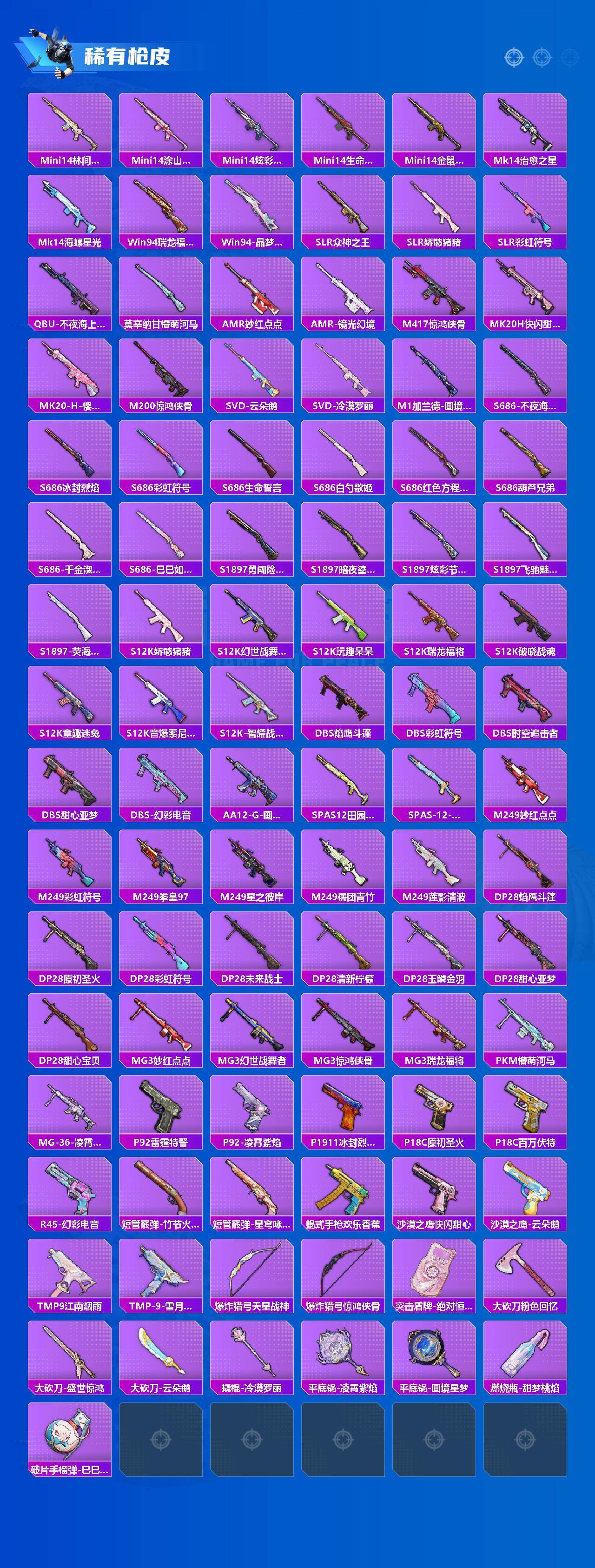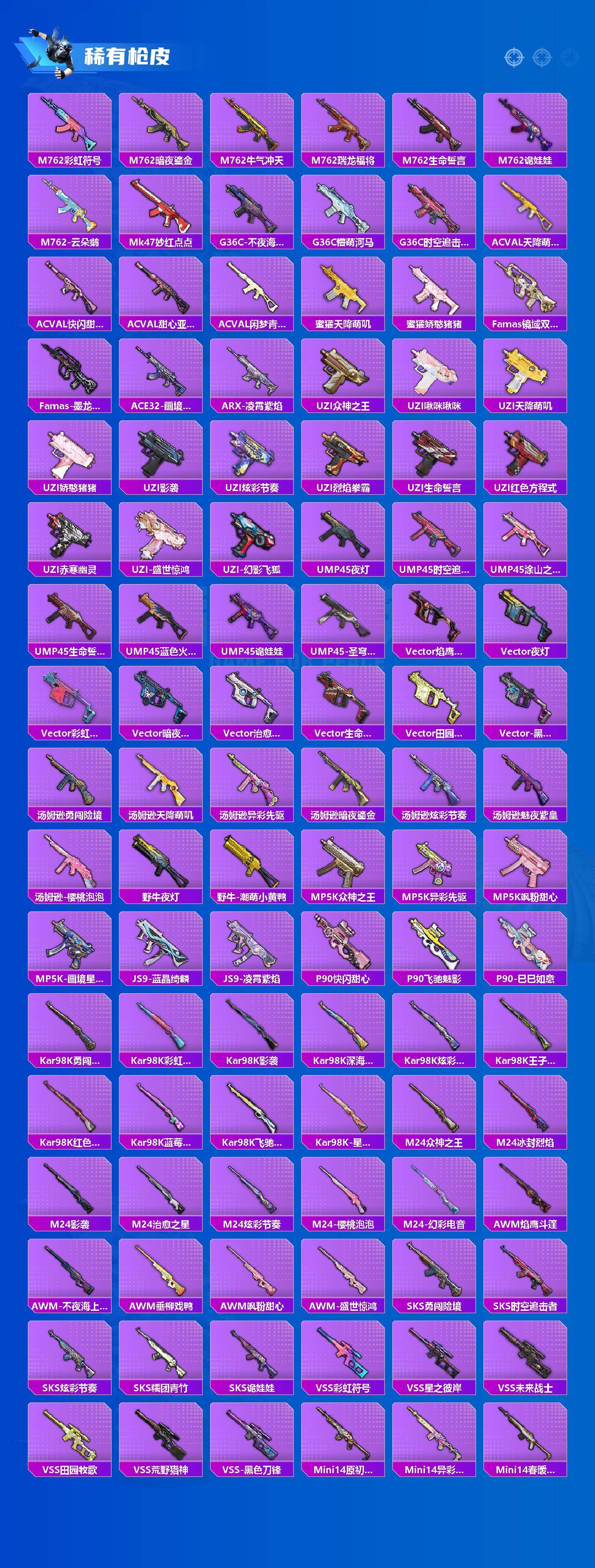 【粉色枪皮】:AKM-星际浪客,SCAR-L-锦绣绵绵,M416-五爪金龙,GROZA-镜光银凌,AUG-暖羊咩咩,ARX-无垠阁,UMP45-量子极限,AKS-74U-信仰神谕,AKS-74U-森灵之息,Kar98K-巳巳如意,Mk14-盛世惊鸿,Mk14-樱桃泡泡,M249-绝对恒星,DP-28-暗夜鎏金,DP-28-豹影疾电,MG-36-幻彩电音,MG-36-沧焰双生