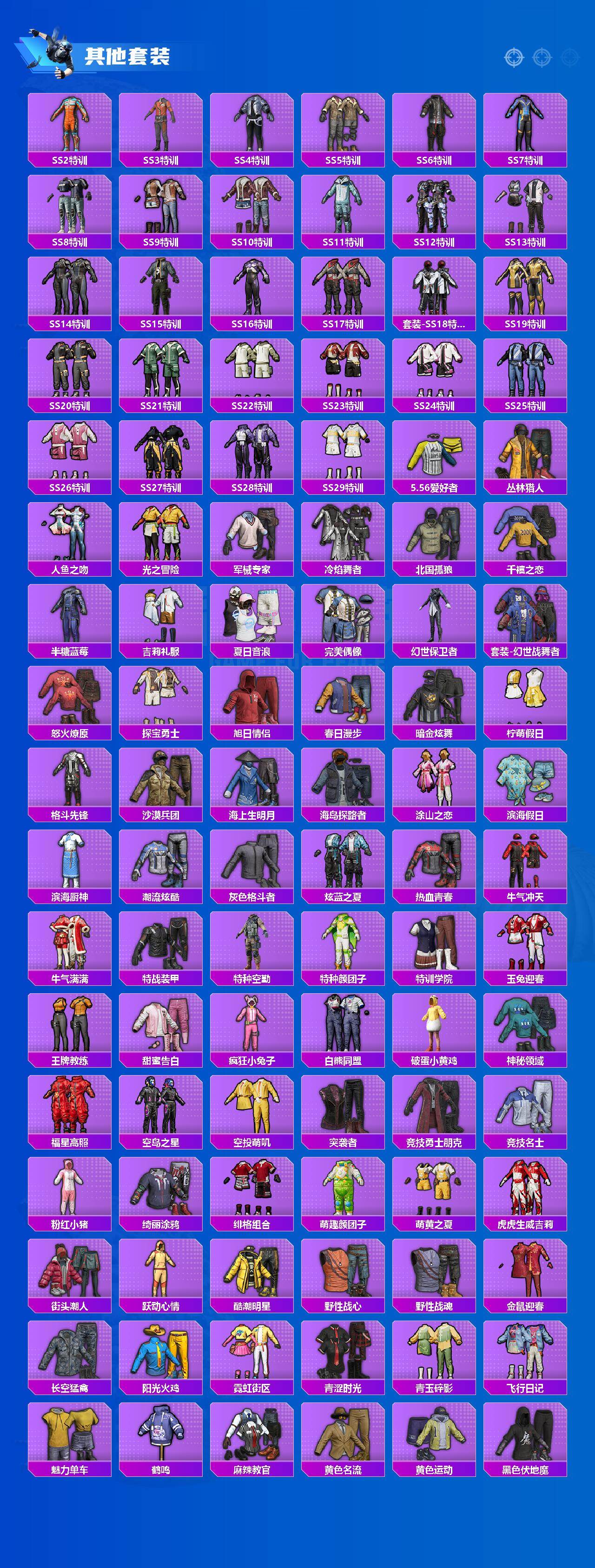 套装-缤纷油彩,套装-都市猎人,套装-王牌四分卫,套装-星之彼岸,套装-馨动时刻,套装-暗夜玫瑰,套装-彩虹鹿灵,套装-山涧鹿灵,套装-妙趣可丽,套装-心之回忆,套装-纯珍童话,角色-呆萌星弥,角色-圣堂之誓,角色-美雪,角色-光极星,套装-创世·救赎,角色-千金淑猫,角色-樱桃泡泡,套装-鹰眼刺客,套装-呆萌铁蟹,套装-梦魇先生,套装-万圣娃娃