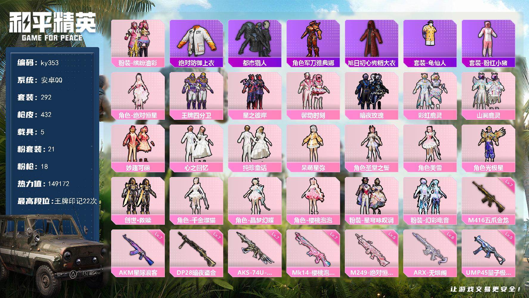 [17002480]安卓 手Q-21粉装-18特效枪-5载具-8粉色飞行器-149172热力值-22王牌印记-292套装-432枪皮