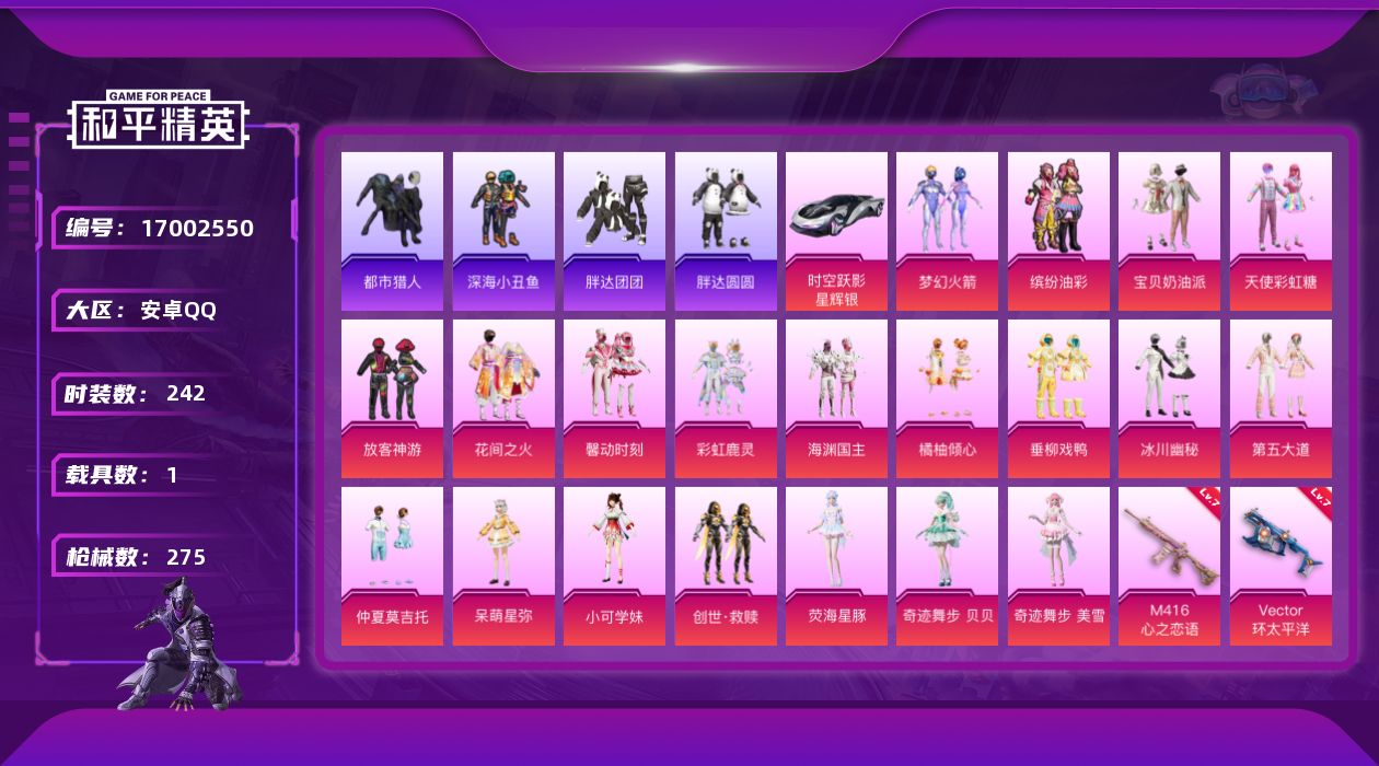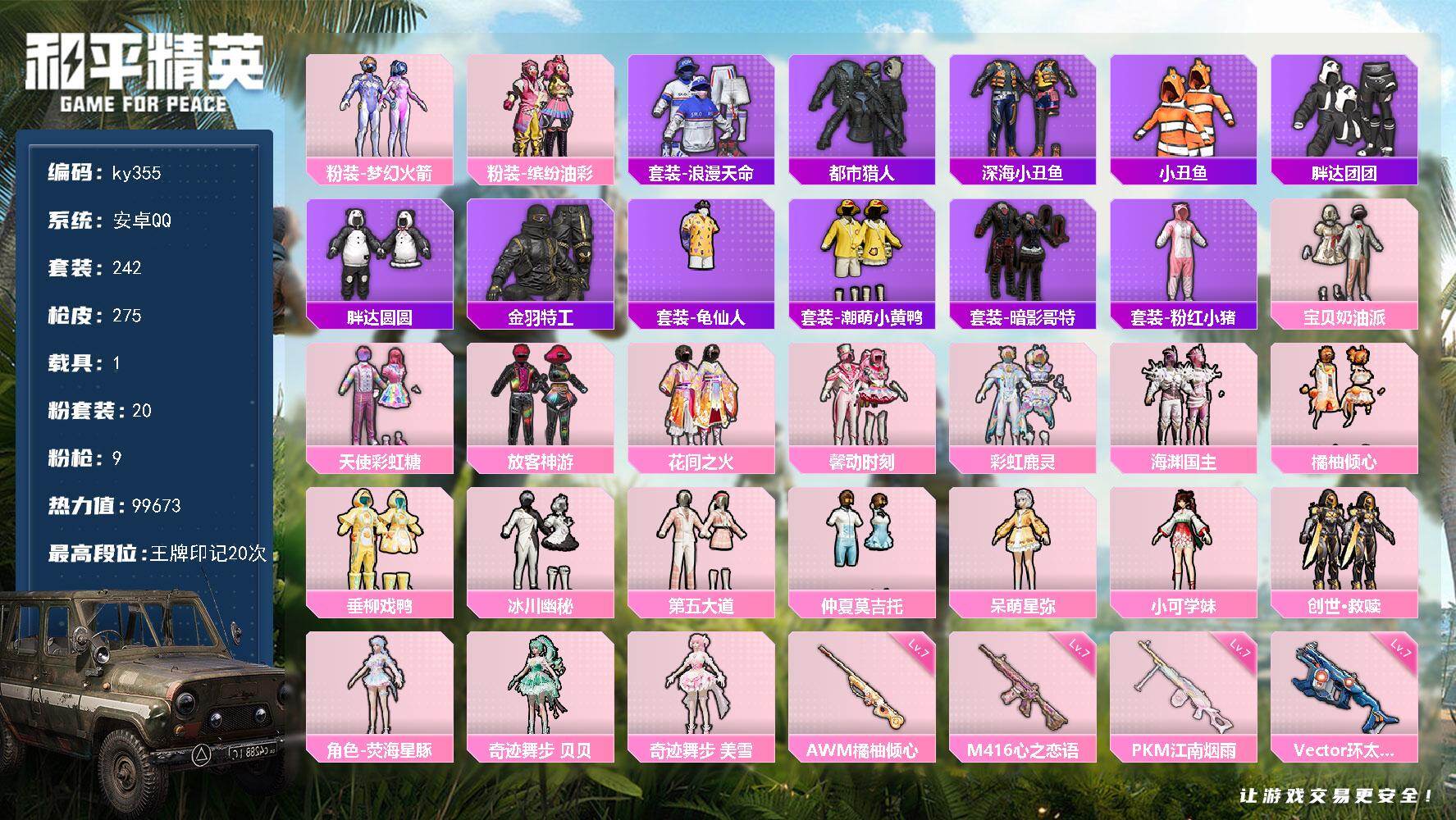 [17002550]安卓 手Q-20粉装-9特效枪-1载具-3粉色飞行器-99673热力值-20王牌印记-242套装-275枪皮