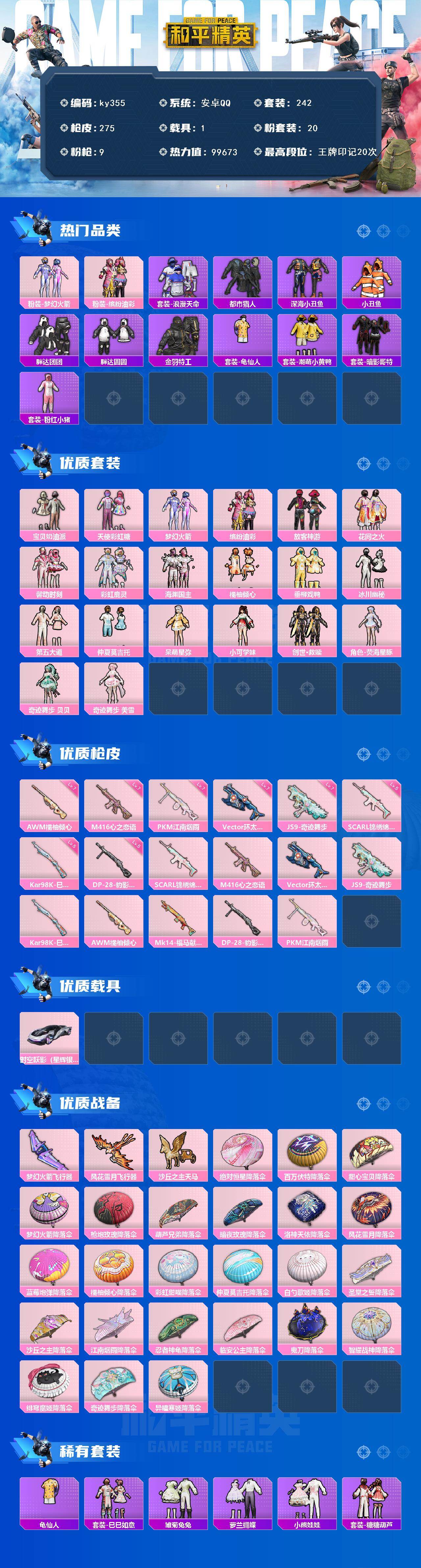 [17002550]安卓 手Q-20粉装-9特效枪-1载具-3粉色飞行器-99673热力值-20王牌印记-242套装-275枪皮 【热门品类】:粉装-梦幻火箭,粉装-缤纷油彩,套装-浪漫天命,套装-都市猎人,套装-深海小丑鱼,套装-小丑鱼,套装-胖达团团,套装-胖达圆圆,套装-金羽特工,套装-龟仙人,套装-潮萌小黄鸭,套装-暗影哥特,套装-粉红小猪 【粉色套装】:粉装-宝贝奶油派,粉装-天使彩虹糖,粉装-梦幻火箭,粉装-缤纷油彩,粉装-放客神游,粉装-花间之火,粉装-馨动时刻,粉装-彩虹鹿灵,粉装-海渊国主,粉装-橘柚倾心,粉装-垂柳戏鸭,粉装-冰川幽秘,粉装-第五大道,粉装-仲夏莫吉托,角色-呆萌星弥,角色-小可学妹,套装-创世·救赎,角色-荧海星豚,角色-奇迹舞步 贝贝,角色-奇迹舞步 美雪 【粉色枪皮等级】:SCAR-L-锦绣绵绵(五级),M416-心之恋语(七级),Vector-环太平洋(七级),JS9-奇迹舞步(七级),Kar98K-巳巳如意(五级),AWM-橘柚倾心(七级),DP-28-豹影疾电(五级),PKM-江南烟雨(七级) 【粉色载具】:时空跃影(星辉银) 【粉色枪皮】:SCAR-L-锦绣绵绵,M416-心之恋语,Vector-环太平洋,JS9-奇迹舞步,Kar98K-巳巳如意,AWM-橘柚倾心,Mk14-福马献瑞,DP-28-豹影疾电,PKM-江南烟雨 【粉色飞行器】:梦幻火箭飞行器,风花雪月飞行器,沙丘之主天马 【粉色降落伞】:绝对恒星降落伞,百万伏特降落伞,甜心宝贝降落伞,梦幻火箭降落伞,枪炮玫瑰降落伞,葫芦兄弟降落伞,暗夜玫瑰降落伞,洛神天依降落伞,风花雪月降落伞,蓝莓炮弹降落伞,橘柚倾心降落伞,彩虹甜喵降落伞,仲夏莫吉托降落伞,白勺歌姬降落伞,圣堂之誓降落伞,沙丘之主降落伞,江南烟雨降落伞,忍者神龟降落伞,临安公主降落伞,鬼刀降落伞,智耀战神降落伞,绯穹魔姬降落伞,奇迹舞步降落伞,异瞳寒姬降落伞 【稀有套装】:套装-龟仙人,套装-巳巳如意,套装-雪国风尚,套装-雏菊兔兔,套装-萝兰蝴蝶,套装-小熊娃娃,套装-糖糖葫芦,套装-青团波波,角色-摩登魅猫,套装-燕燕于飞,套装-鱼渊荷华,套装-闪电轻猫,套装-紫幽梦,套装-蓝冰羽,套装-极速光影,套装-云朵鹅,套装-雪绒豹,角色-夜瞳黯灵,套装-朱霞炽焰,套装-凌霄紫焰,套装-擎苍青焰 【稀有枪皮】:AKM-2P