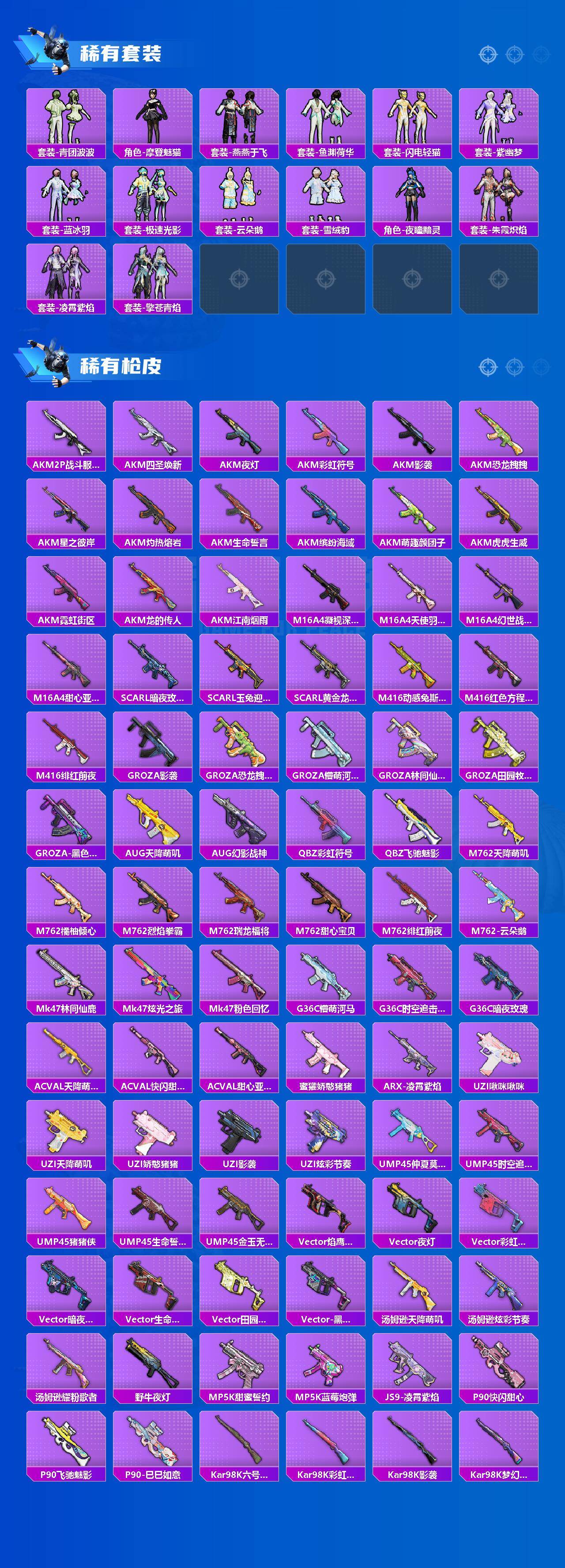 【稀有套装】:套装-龟仙人,套装-巳巳如意,套装-雪国风尚,套装-雏菊兔兔,套装-萝兰蝴蝶,套装-小熊娃娃,套装-糖糖葫芦,套装-青团波波,角色-摩登魅猫,套装-燕燕于飞,套装-鱼渊荷华,套装-闪电轻猫,套装-紫幽梦,套装-蓝冰羽,套装-极速光影,套装-云朵鹅,套装-雪绒豹,角色-夜瞳黯灵,套装-朱霞炽焰,套装-凌霄紫焰,套装-擎苍青焰