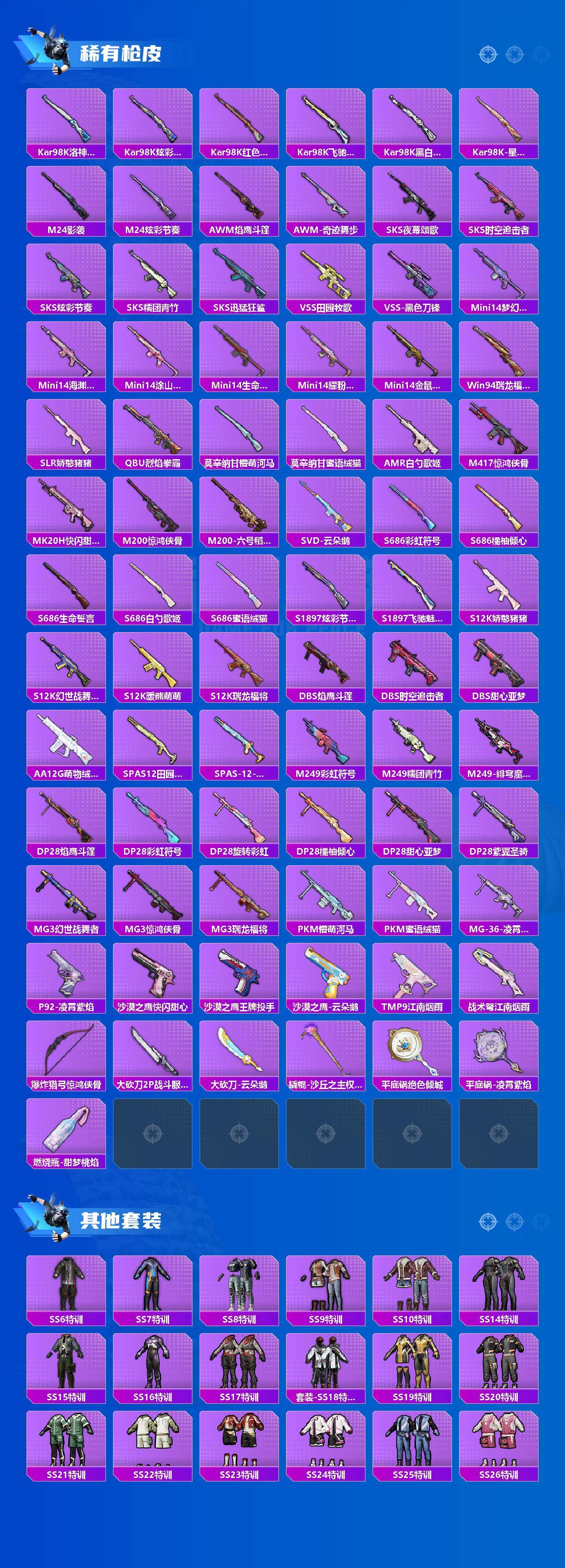 - [16336124]【特价出售/店主推荐】苹果 手Q-3粉装-5特效枪-0载具-0粉色飞行器-39535热力值-10王牌印记-95套装-140枪皮 【热门品类】:套装-龟仙人,角色-8号机,角色-Mark.06 【粉色套装】:角色-洛天依,角色-圣堂之誓,角色-烟云彩露 【粉色枪皮等级】:SCAR-L-锦绣绵绵(五级),M416-电玩时刻(五级),Kar98K-巳巳如意(五级),DP-28-豹影疾电(一级),爆炸猎弓-拳皇·狂花道(五级) 【粉色枪皮】:SCAR-L-锦绣绵绵,M416-电玩时刻,Kar98K-巳巳如意,DP-28-豹影疾电,爆炸猎弓-拳皇·狂花道 【粉色降落伞】:洛神天依降落伞,庄周梦蝶降落伞,环太平洋降落伞,垂柳戏鸭降落伞,旋转彩虹降落伞,飒粉甜心降落伞,圣堂之誓降落伞,猪猪侠降落伞,江南烟雨降落伞,精灵梦叶罗丽降落伞,守护天翼降落伞,初号机 觉醒Ver.降落伞 【稀有套装】:套装-龟仙人,套装-巳巳如意,套装-雏菊兔兔,套装-萝兰蝴蝶 【稀有枪皮】:AKM-恐龙拽拽,AKM-霓虹街区,AKM-龙的传人,M16A4-幻世战舞者,M16A4-甜心亚梦,SCAR-L-炫彩节奏,SCAR-L-玉兔迎春,SCAR-L-红色方程式,M416-糯团青竹,M416-红色方程式,GROZA-异彩先驱,GROZA-影袭,GROZA-春暖花开,GROZA-田园牧歌,QBZ-洛神天依,QBZ-飞驰魅影,M762-天星战神,M762-天降萌叽,M762-第五大道,Mk47-洛神天依,AC-VAL-天降萌叽,AC-VAL-快闪甜心,AC-VAL-甜心亚梦,蜜獾-天降萌叽,蜜獾-娇憨猪猪,UZI-啾咪啾咪,UZI-天降萌叽,UZI-娇憨猪猪,UMP45-仲夏莫吉托,UMP45-涂山之恋,UMP45-生命誓言,UMP45-诡娃娃,Vector-焰鹰斗篷,Vector-生命誓言,Vector-田园牧歌,Vector-金玉无双,汤姆逊-天降萌叽,汤姆逊-异彩先驱,MP5K-异彩先驱,P90-快闪甜心,P90-飞驰魅影,P90-巳巳如意,Kar98K-彩虹符号,Kar98K-洛神天依,Kar98K-炫彩节奏,Kar98K-王子的夏天,Kar98K-飞驰魅影,AWM-焰鹰斗篷,AWM-圣堂之誓,AWM-飒粉甜心,SKS-糯团青竹,VSS-田园牧歌,VSS-碧影闪光,Mini14-异彩先驱,Mini14
