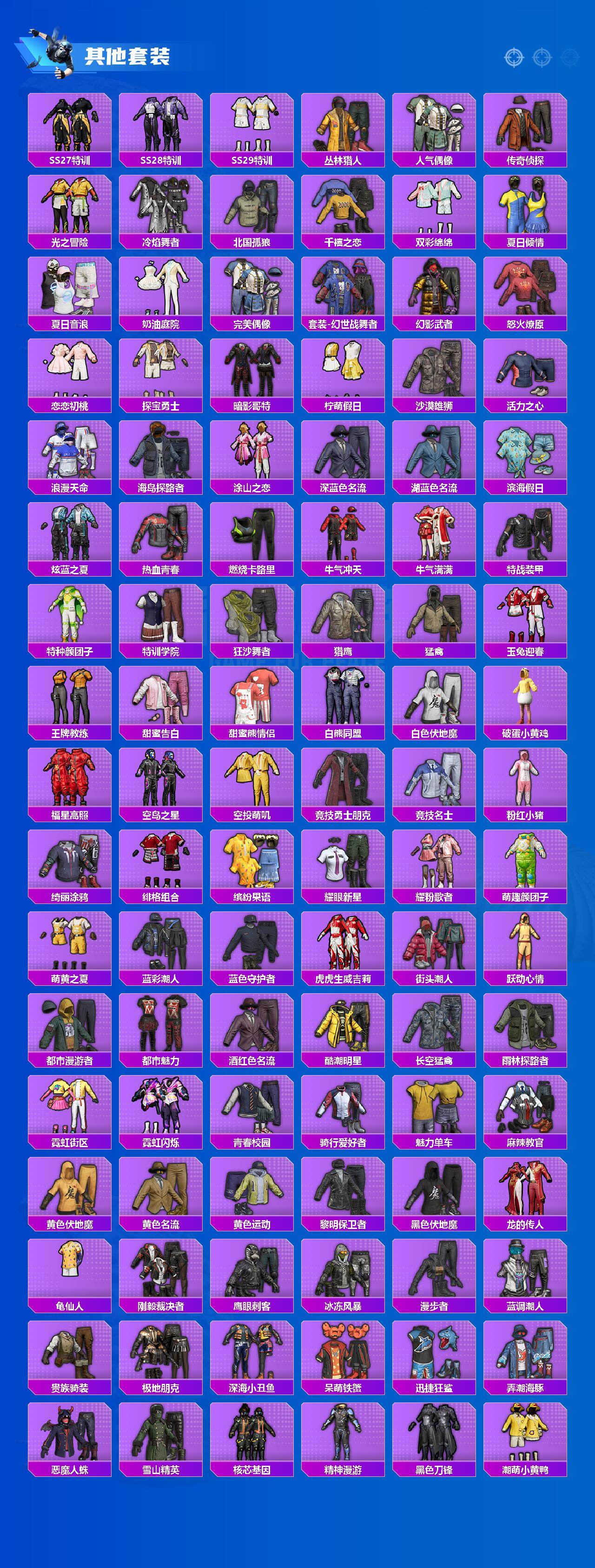 套装-梦幻火箭,套装-缤纷油彩,套装-都市猎人,套装-深海小丑鱼,套装-胖达团团,套装-胖达圆圆,套装-潮萌小黄鸭,套装-宝贝奶油派,套装-天使彩虹糖,套装-放客神游,套装-花间之火,套装-馨动时刻,套装-彩虹鹿灵,套装-海渊国主,套装-橘柚倾心,套装-垂柳戏鸭,套装-冰川幽秘,套装-第五大道,套装-仲夏莫吉托,角色-呆萌星弥,角色-小可学妹,套装-创世·救赎,套装-鹰眼刺客,套装-呆萌铁蟹,套装-迅捷狂鲨,套装-奶芙汪汪