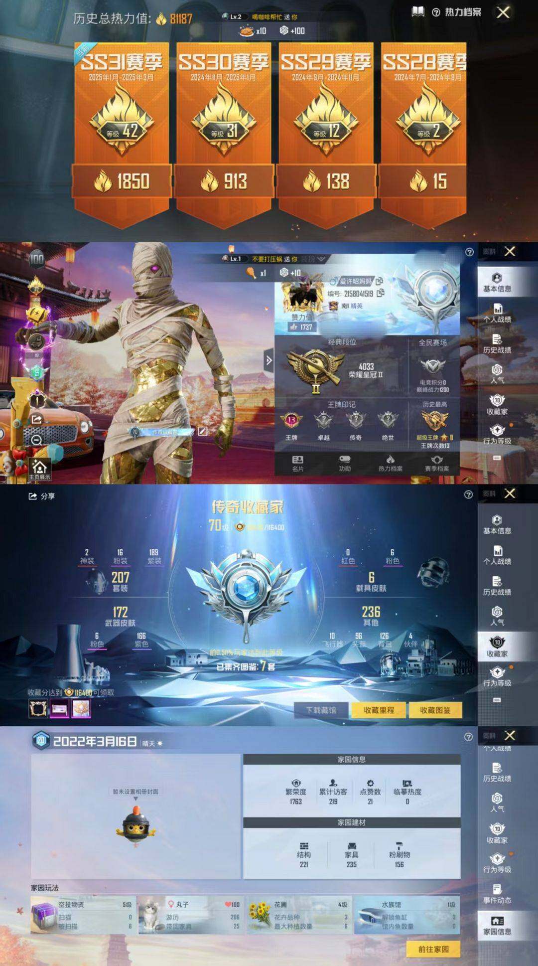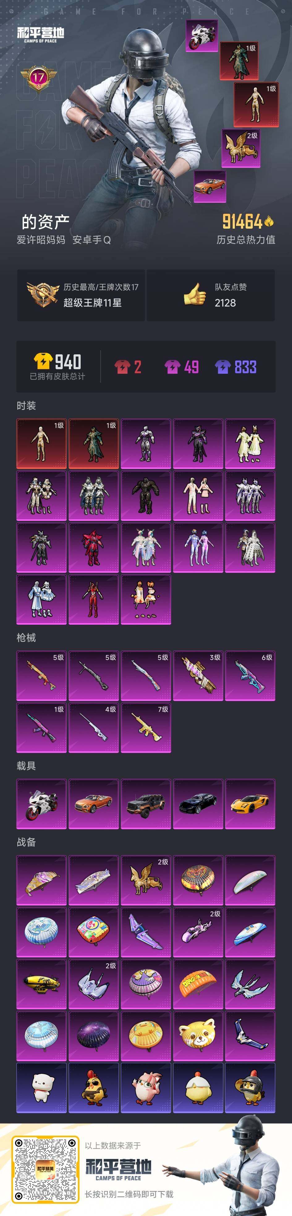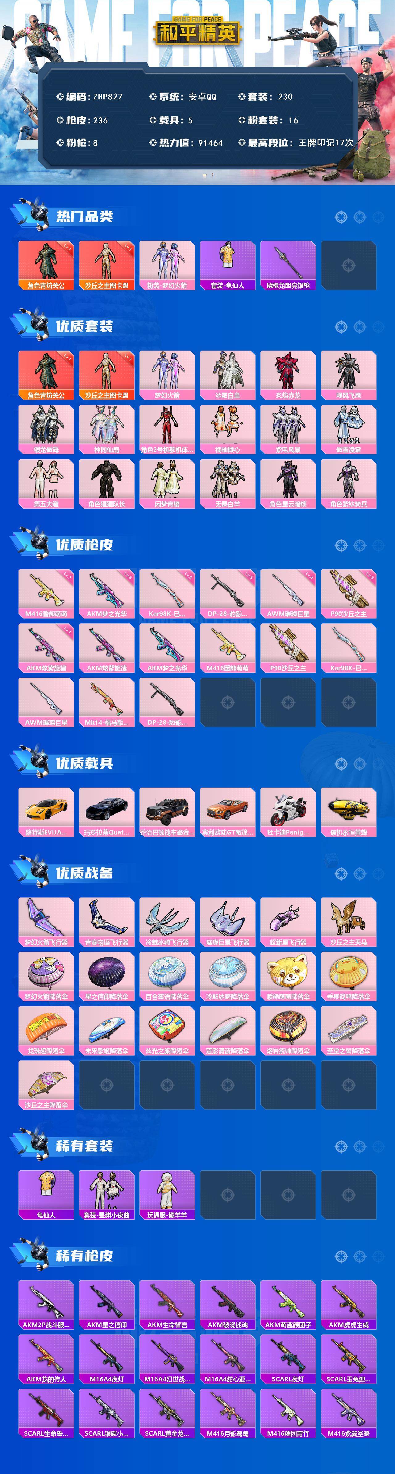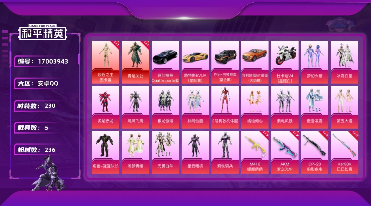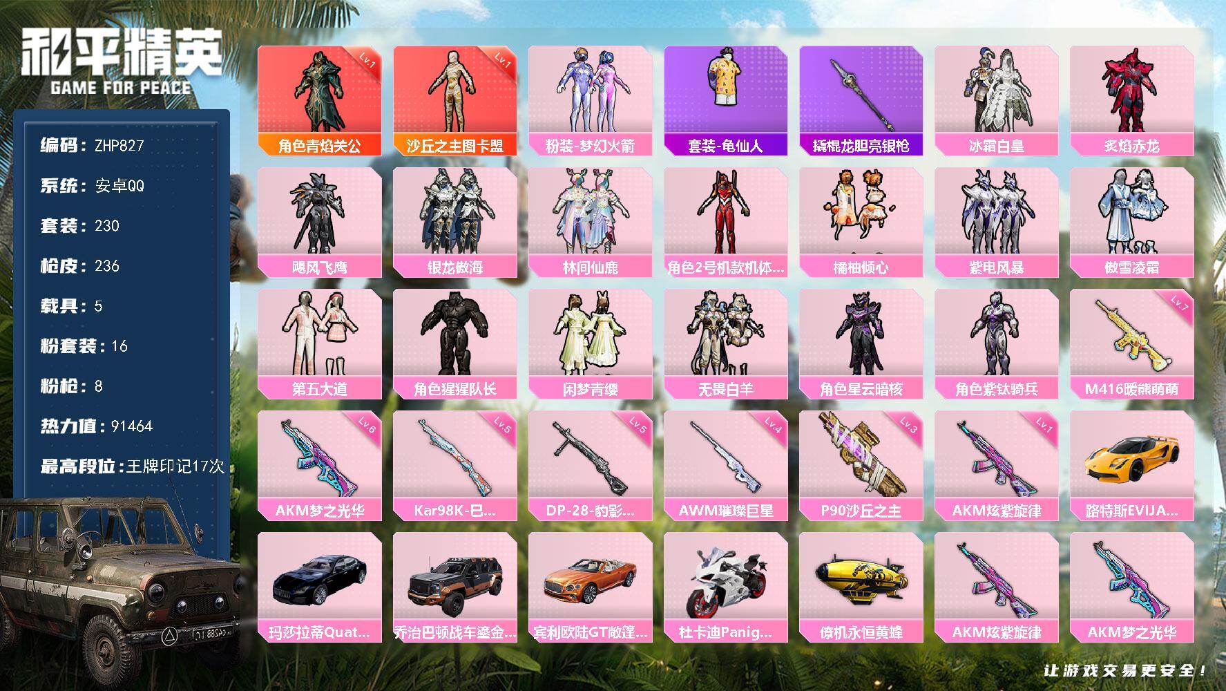 [17003943]安卓 手Q-2神装-16粉装-8特效枪-5载具-6粉色飞行器-91464热力值-17王牌印记-230套装-236枪皮