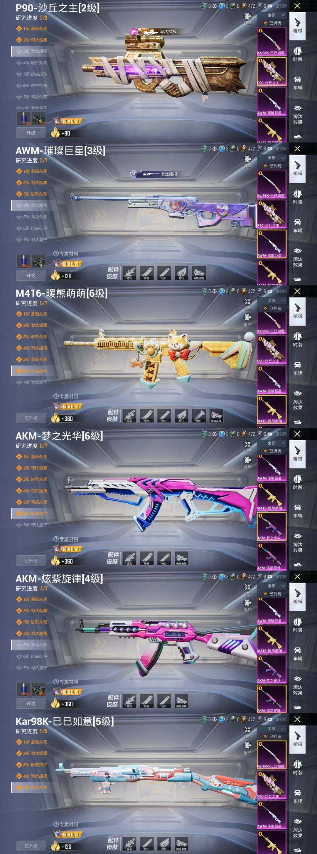 AKM-炫紫旋律,AKM-梦之光华,M416-暖熊萌萌,P90-沙丘之主,Kar98K-巳巳如意,AWM-璀璨巨星
