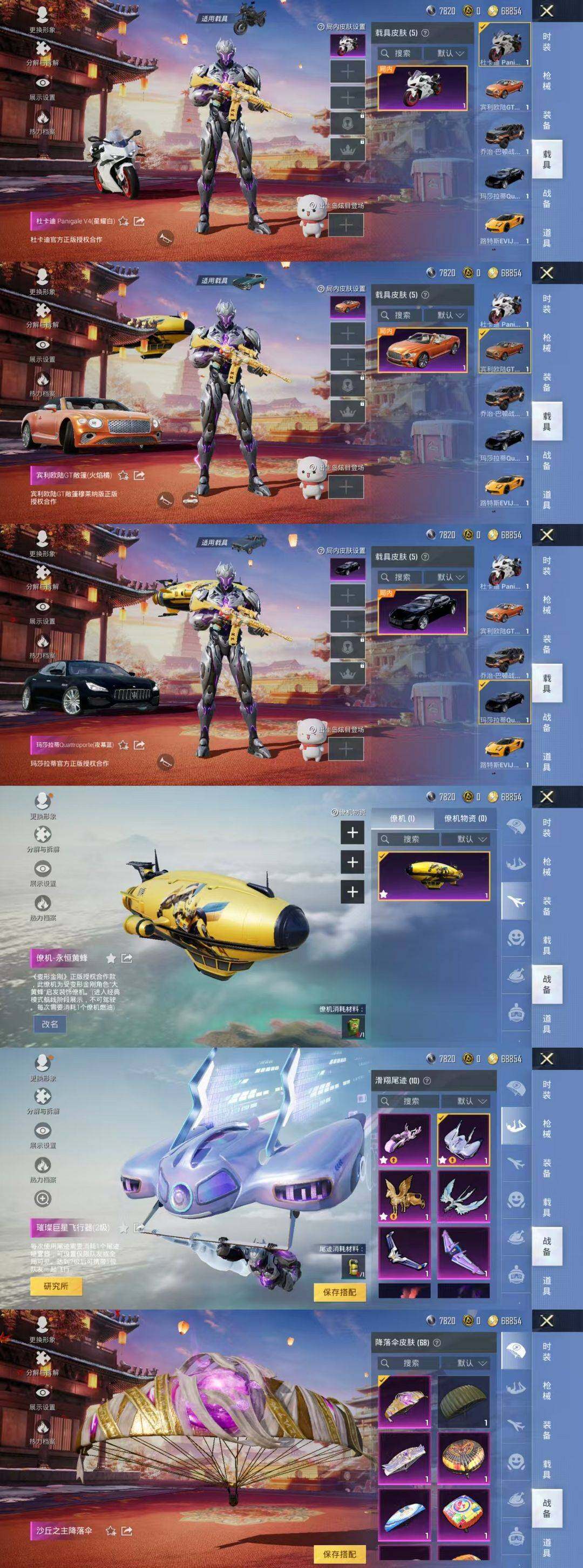 【粉色载具】:路特斯EVIJA(星际黄),玛莎拉蒂Quattroporte(夜幕蓝),乔治巴顿战车(鎏金黑),宾利欧陆GT敞篷(火焰橘),杜卡迪 Panigale V4(星耀白),僚机-永恒黄蜂