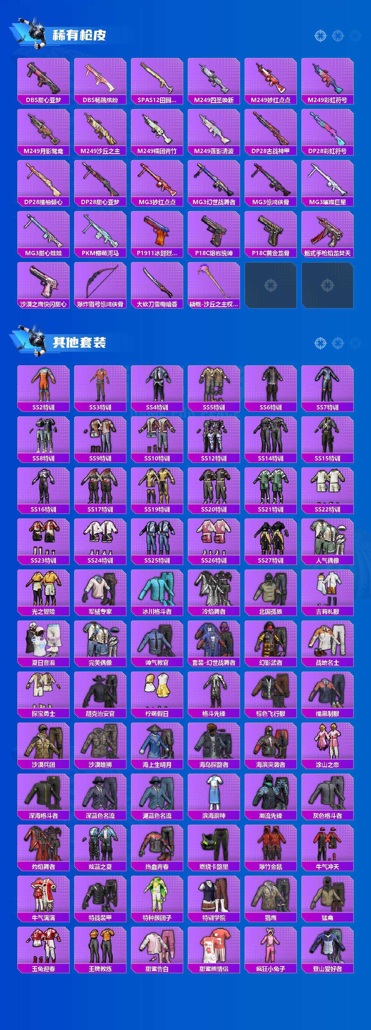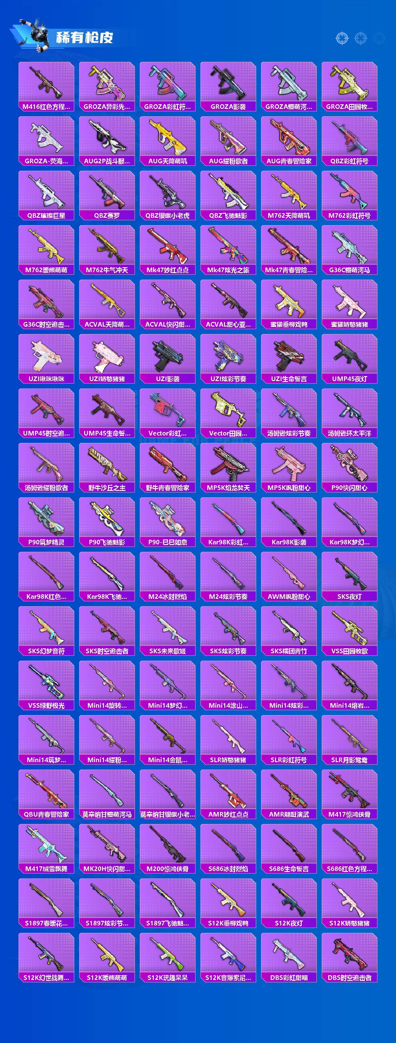 【稀有枪皮】:AKM-2P战斗服款,AKM-星之信仰,AKM-生命誓言,AKM-破晓战魂,AKM-萌趣颜团子,AKM-虎虎生威,AKM-龙的传人,M16A4-夜灯,M16A4-幻世战舞者,M16A4-甜心亚梦,SCAR-L-夜灯,SCAR-L-玉兔迎春,SCAR-L-生命誓言,SCAR-L-银碳小老虎,SCAR-L-黄金龙骨,M416-月影鸳鸯,M416-糯团青竹,M416-紫翼圣骑,M416-红色方程式,GROZA-异彩先驱,GROZA-彩虹符