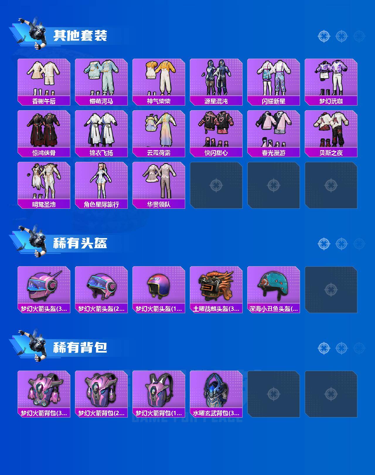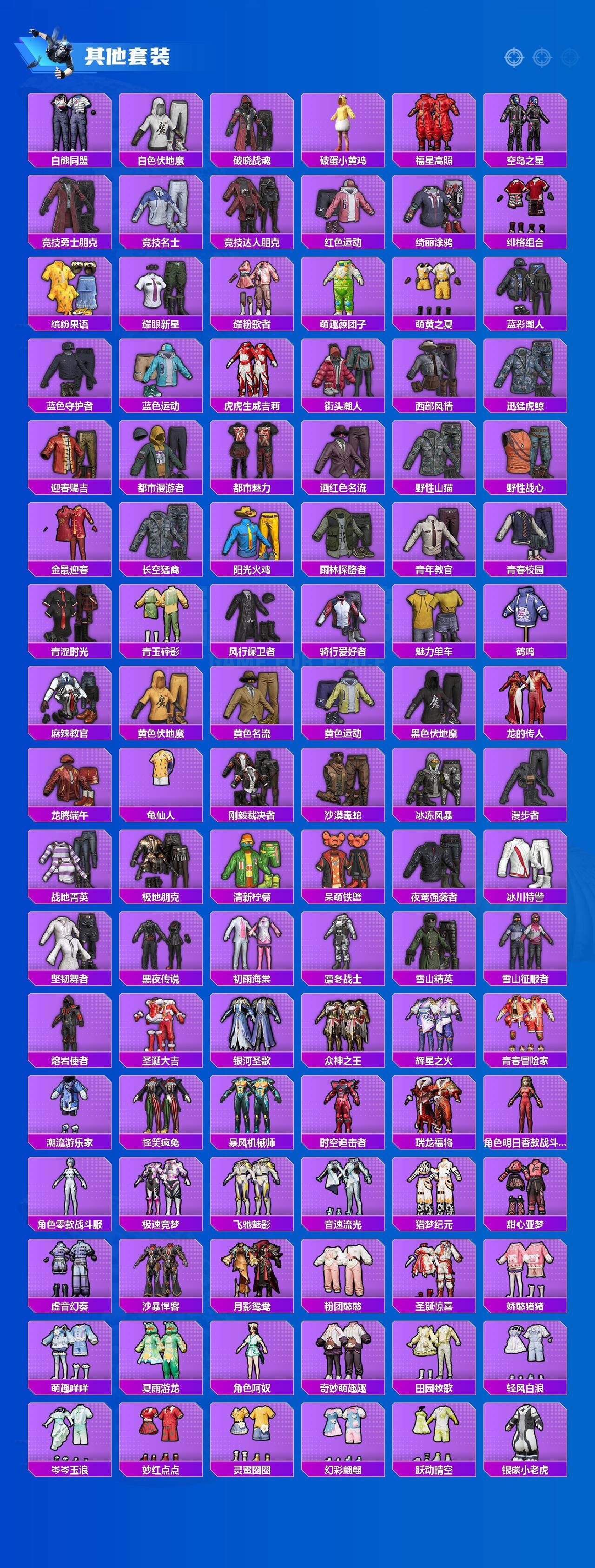 【粉色套装】:粉装-梦幻火箭,粉装-冰霜白皇,粉装-炙焰赤龙,粉装-飓风飞鹰,粉装-银龙傲海,粉装-林间仙鹿,角色-2号机款机体服,粉装-橘柚倾心,粉装-紫电风暴,粉装-傲雪凌霜,粉装-第五大道,角色-猩猩队长,粉装-闲梦青缨,粉装-无畏白羊,角色-星云暗核,角色-紫钛骑兵