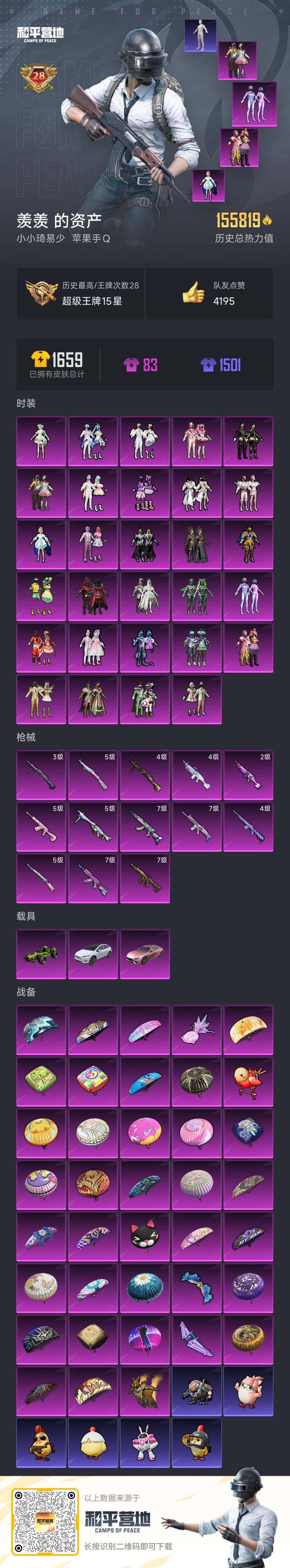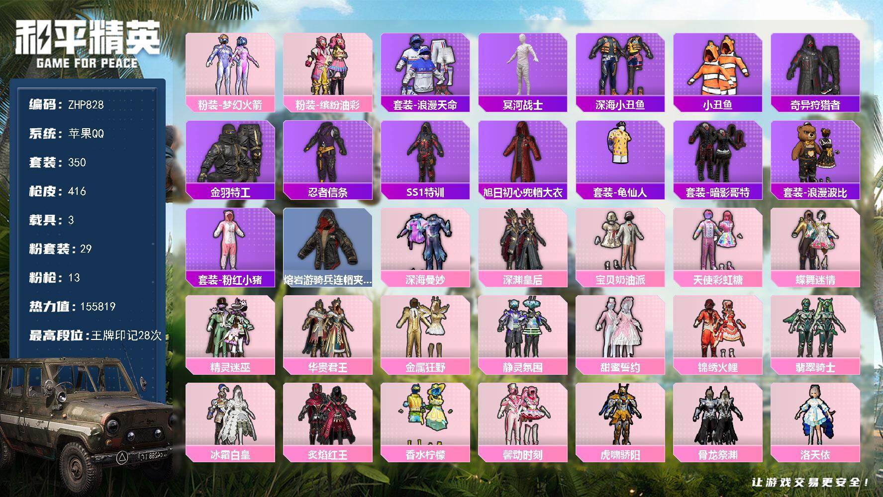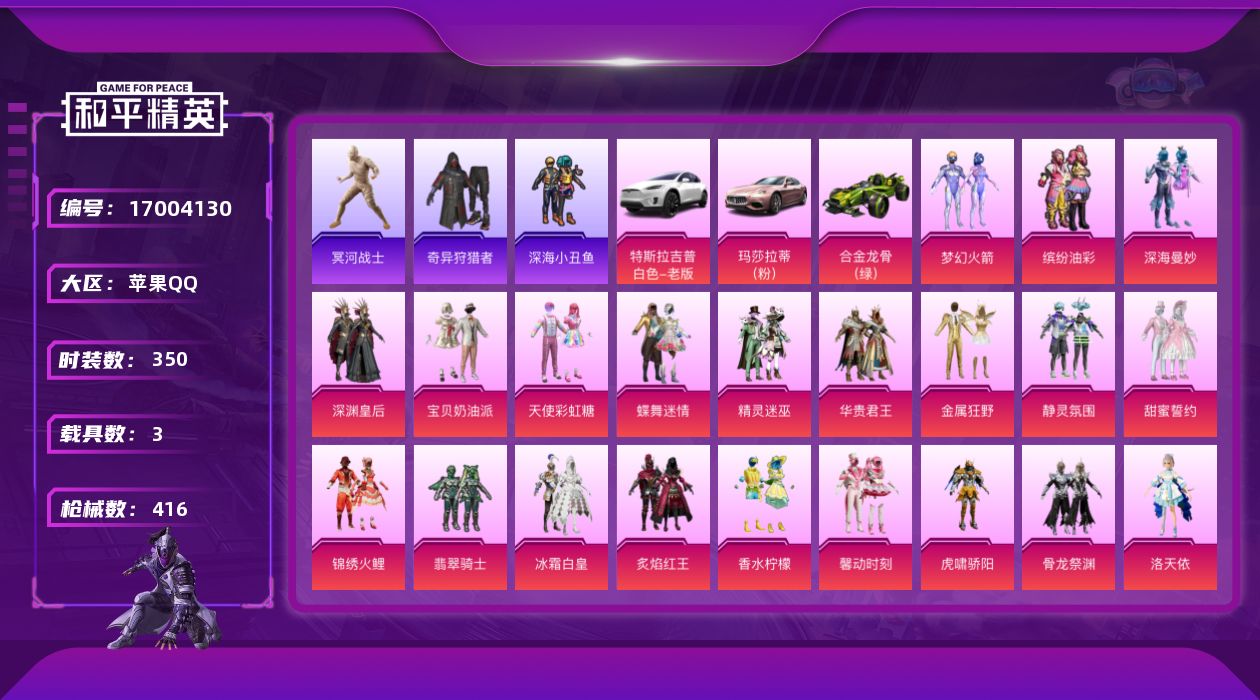 [17004130]苹果 手Q-老木乃伊-29粉装-13特效枪-3载具-5粉色飞行器-155819热力值-28王牌印记-350套装-416枪皮