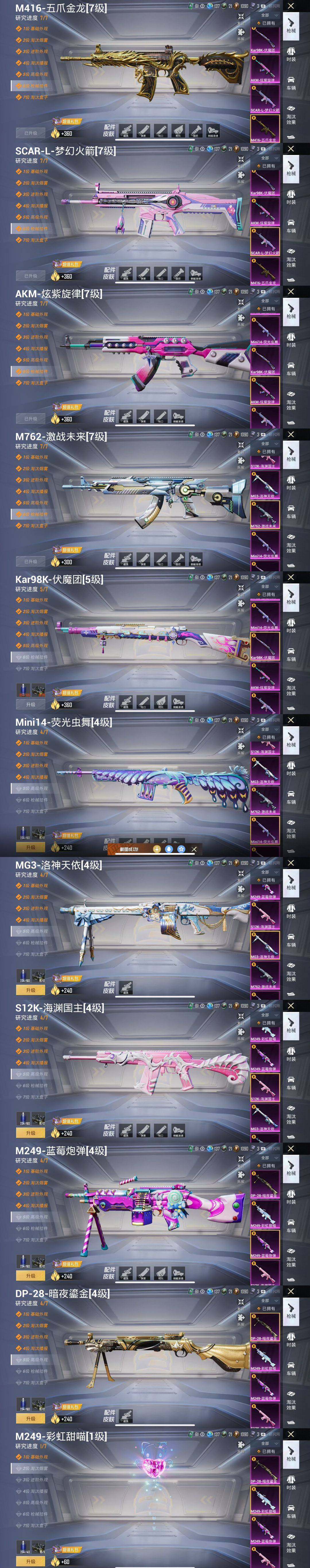 【粉色枪皮等级】:AKM-炫紫旋律(七级),SCAR-L-梦幻火箭(七级),M416-五爪金龙(七级),M762-激战未来(七级),Kar98K-伏魔团(五级),Kar98K-巳巳如意(五级),Mini14-荧光虫舞(四级),S12K-海渊国主(五级),M249-蓝莓炮弹(二级),M249-彩虹甜喵(四级),DP-28-暗夜鎏金(四级),DP-28-豹影疾电(三级),MG3-洛神天依(五级)