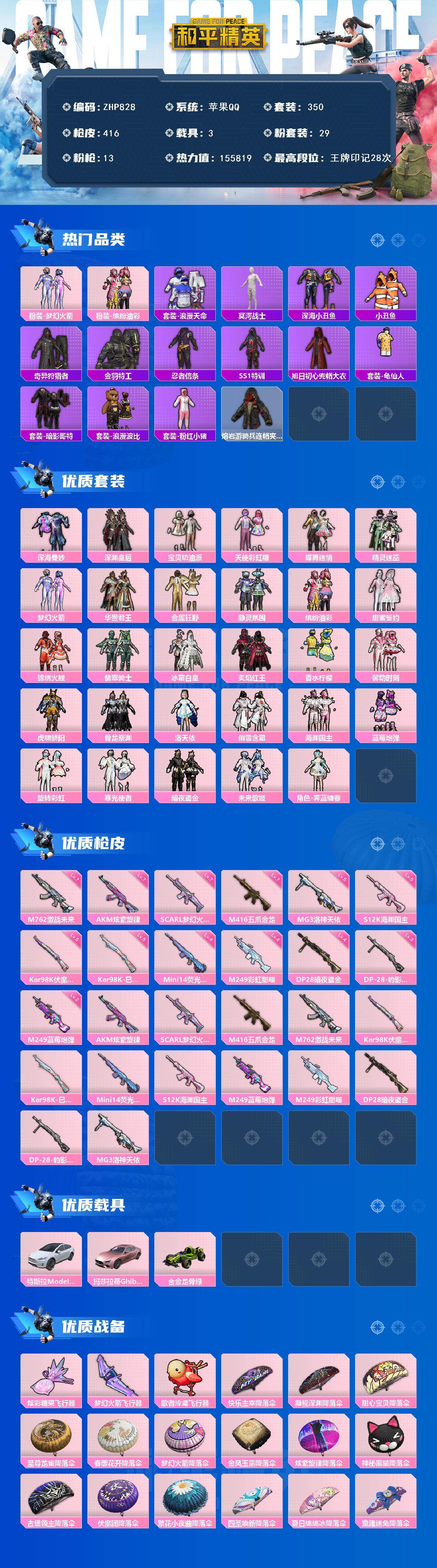 [17004130]苹果 手Q-老木乃伊-29粉装-13特效枪-3载具-5粉色飞行器-155819热力值-28王牌印记-350套装-416枪皮 【热门品类】:粉装-梦幻火箭,粉装-缤纷油彩,套装-浪漫天命,套装-冥河战士,套装-深海小丑鱼,套装-小丑鱼,套装-奇异狩猎者,套装-金羽特工,套装-忍者信条,套装-SS1特训,旭日初心兜帽大衣,套装-龟仙人,套装-暗影哥特,套装-浪漫波比,套装-粉红小猪,熔岩游骑兵连帽夹克 【粉色套装】:粉装-深海曼妙,粉装-深渊皇后,粉装-宝贝奶油派,粉装-天使彩虹糖,粉装-蝶舞迷情,粉装-精灵迷巫,粉装-梦幻火箭,粉装-华贵君王,粉装-金属狂野,粉装-静灵氛围,粉装-缤纷油彩,粉装-甜蜜誓约,粉装-锦绣火鲤,粉装-翡翠骑士,粉装-冰霜白皇,粉装-炙焰红王,粉装-香水柠檬,粉装-馨动时刻,粉装-虎啸骄阳,粉装-骨龙祭渊,角色-洛天依,粉装-俏雪含霜,粉装-海渊国主,粉装-蓝莓炮弹,粉装-旋转彩虹,粉装-寒光使者,粉装-暗夜鎏金,粉装-未来歌姬,角色-霁蓝缠春 【粉色枪皮等级】:AKM-炫紫旋律(七级),SCAR-L-梦幻火箭(七级),M416-五爪金龙(七级),M762-激战未来(七级),Kar98K-伏魔团(五级),Kar98K-巳巳如意(五级),Mini14-荧光虫舞(四级),S12K-海渊国主(五级),M249-蓝莓炮弹(二级),M249-彩虹甜喵(四级),DP-28-暗夜鎏金(四级),DP-28-豹影疾电(三级),MG3-洛神天依(五级) 【粉色载具】:特斯拉Model X(珍珠白),玛莎拉蒂Ghibli(粉),合金龙骨(绿) 【粉色枪皮】:AKM-炫紫旋律,SCAR-L-梦幻火箭,M416-五爪金龙,M762-激战未来,Kar98K-伏魔团,Kar98K-巳巳如意,Mini14-荧光虫舞,S12K-海渊国主,M249-蓝莓炮弹,M249-彩虹甜喵,DP-28-暗夜鎏金,DP-28-豹影疾电,MG3-洛神天依 【粉色飞行器】:炫彩糖果飞行器,梦幻火箭飞行器,歌者泠鸢飞行器 【粉色降落伞】:快乐主宰降落伞,凝视深渊降落伞,甜心宝贝降落伞,至尊龙雀降落伞,春暖花开降落伞,梦幻火箭降落伞,金风玉露降落伞,炫紫旋律降落伞,神秘黑猫降落伞,古堡领主降落伞,伏魔团降落伞,繁花小夜曲降落伞,四圣焕新降落伞,夏日绵绵冰降落伞,童趣迷兔降落伞,王牌四分卫降落伞,葫