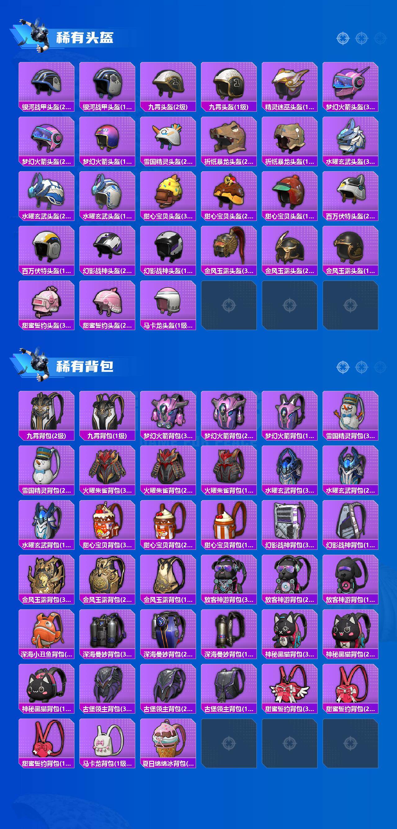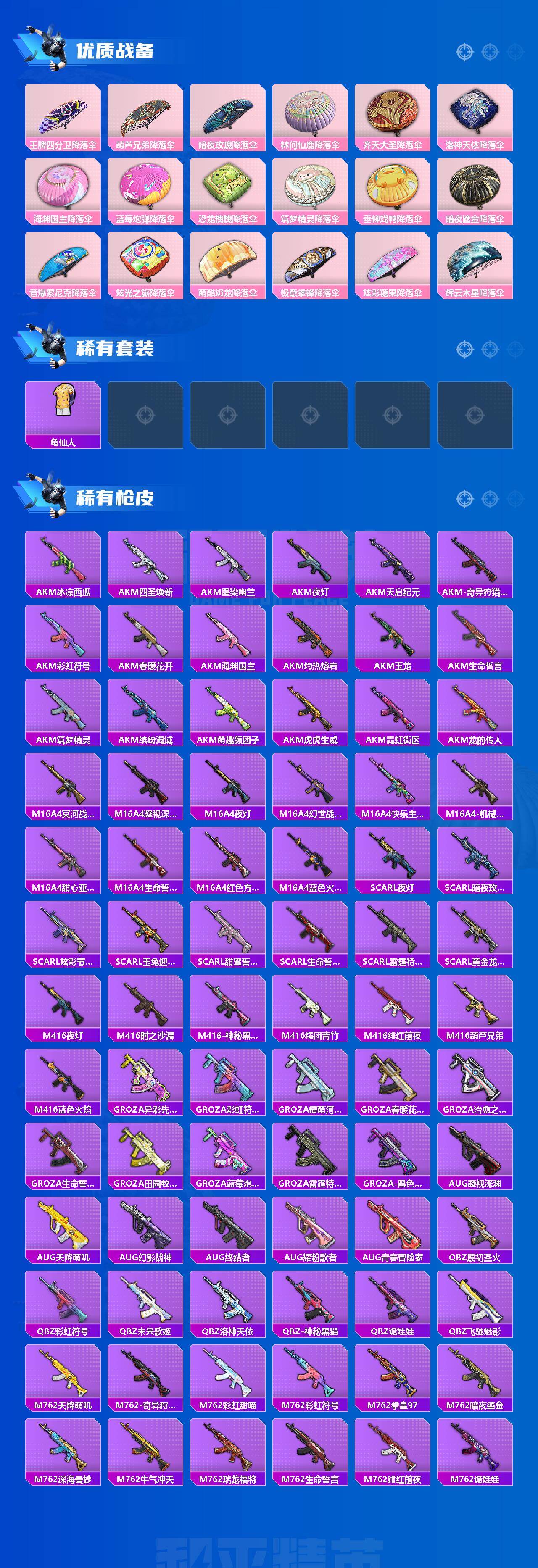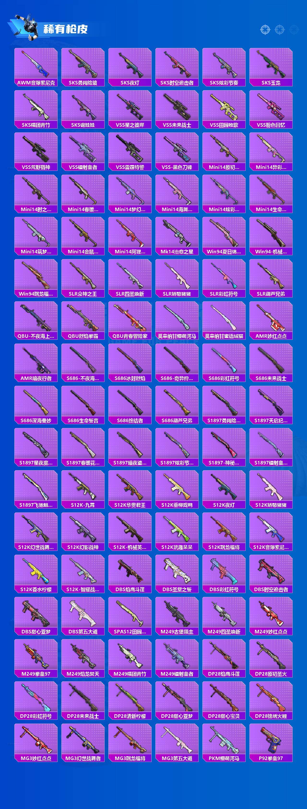 AKM-炫紫旋律,SCAR-L-梦幻火箭,M416-五爪金龙,M762-激战未来,Kar98K-伏魔团,Kar98K-巳巳如意,Mini14-荧光虫舞,S12K-海渊国主,M249-蓝莓炮弹,M249-彩虹甜喵,DP-28-暗夜鎏金,MG3-洛神天依