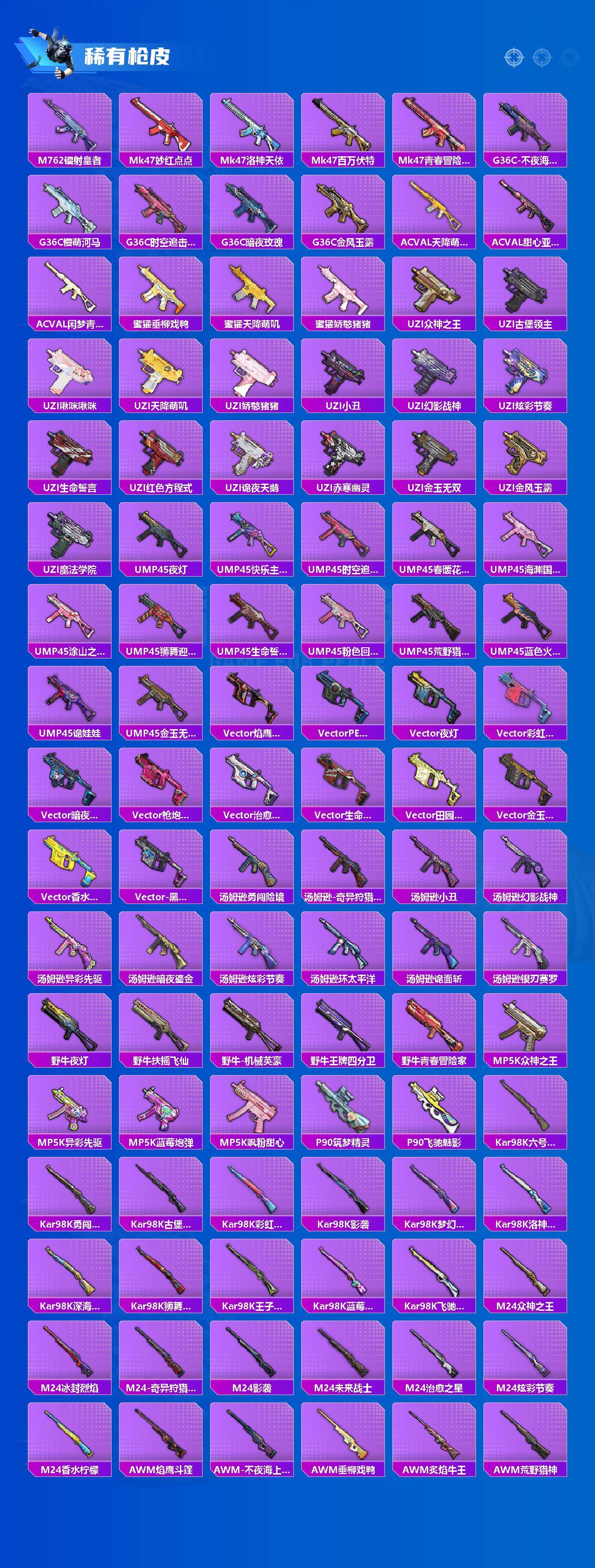 【粉色枪皮】:AKM-炫紫旋律,SCAR-L-梦幻火箭,M416-五爪金龙,M762-激战未来,Kar98K-伏魔团,Kar98K-巳巳如意,Mini14-荧光虫舞,S12K-海渊国主,M249-蓝莓炮弹,M249-彩虹甜喵,DP-28-暗夜鎏金,DP-28-豹影疾电,MG3-洛神天依