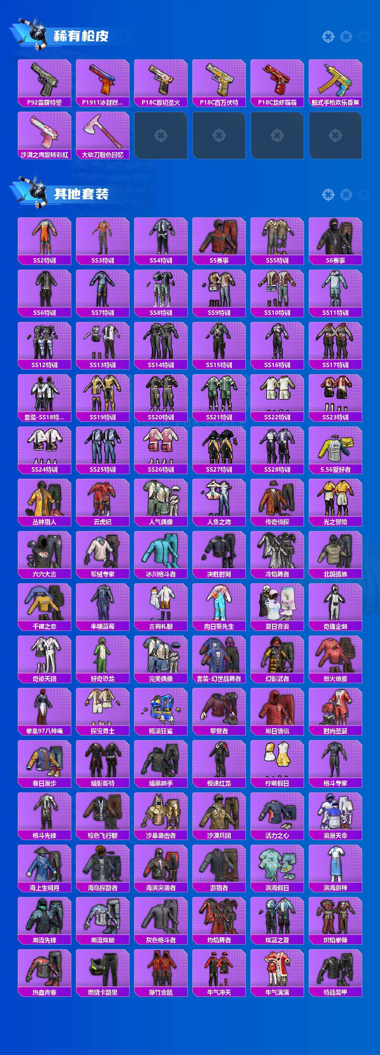 AKM-奇异狩猎者,AKM-缤纷海域,M762-奇异狩猎者,M762-瑞龙福将,Kar98K-古堡领主,Kar98K-深海曼妙,M24-香水柠檬,M24-奇异狩猎者,S686-奇异狩猎者,M249-古堡领主