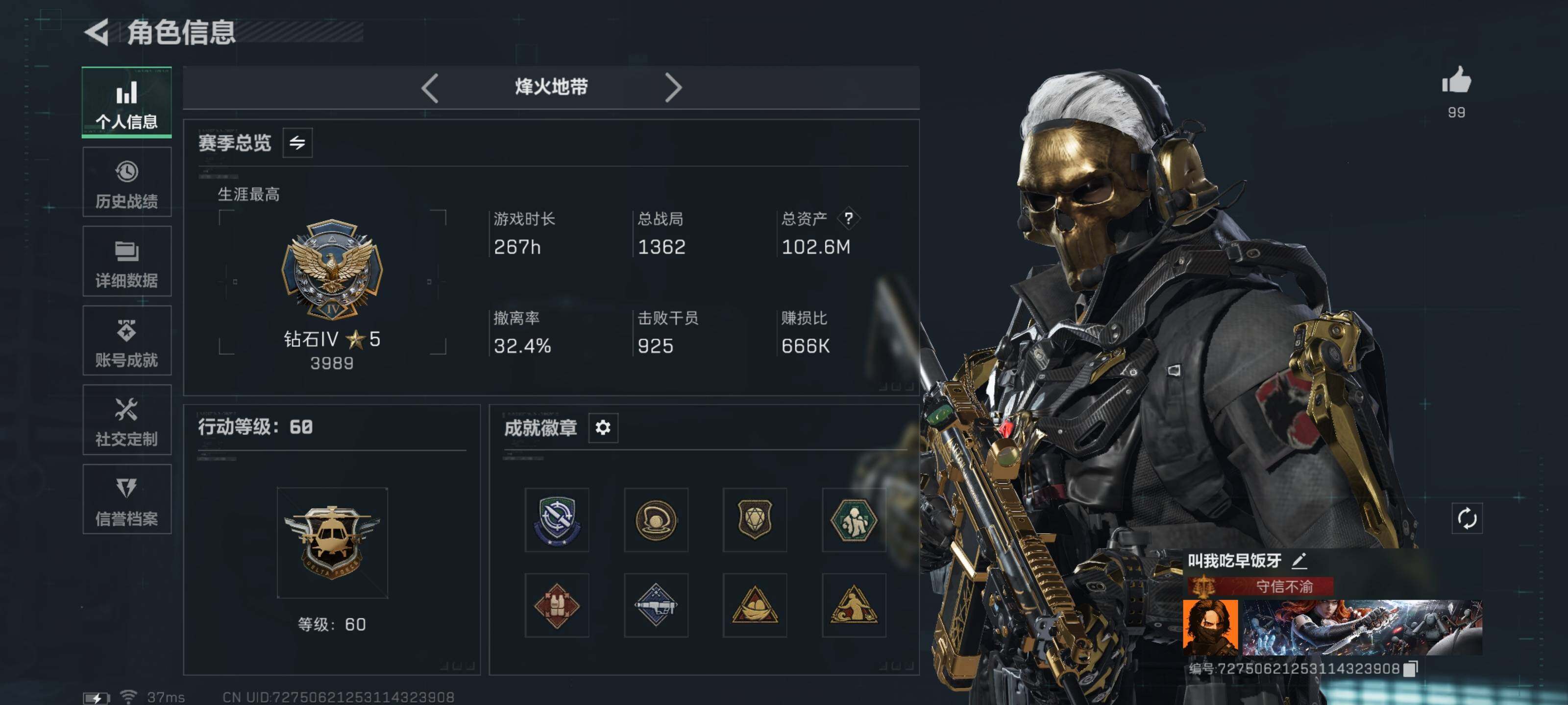 [16336215]【特价出售/店主推荐】102m总资产-1374k哈伏币-60烽火等级-铂金-28战场等级-上等兵