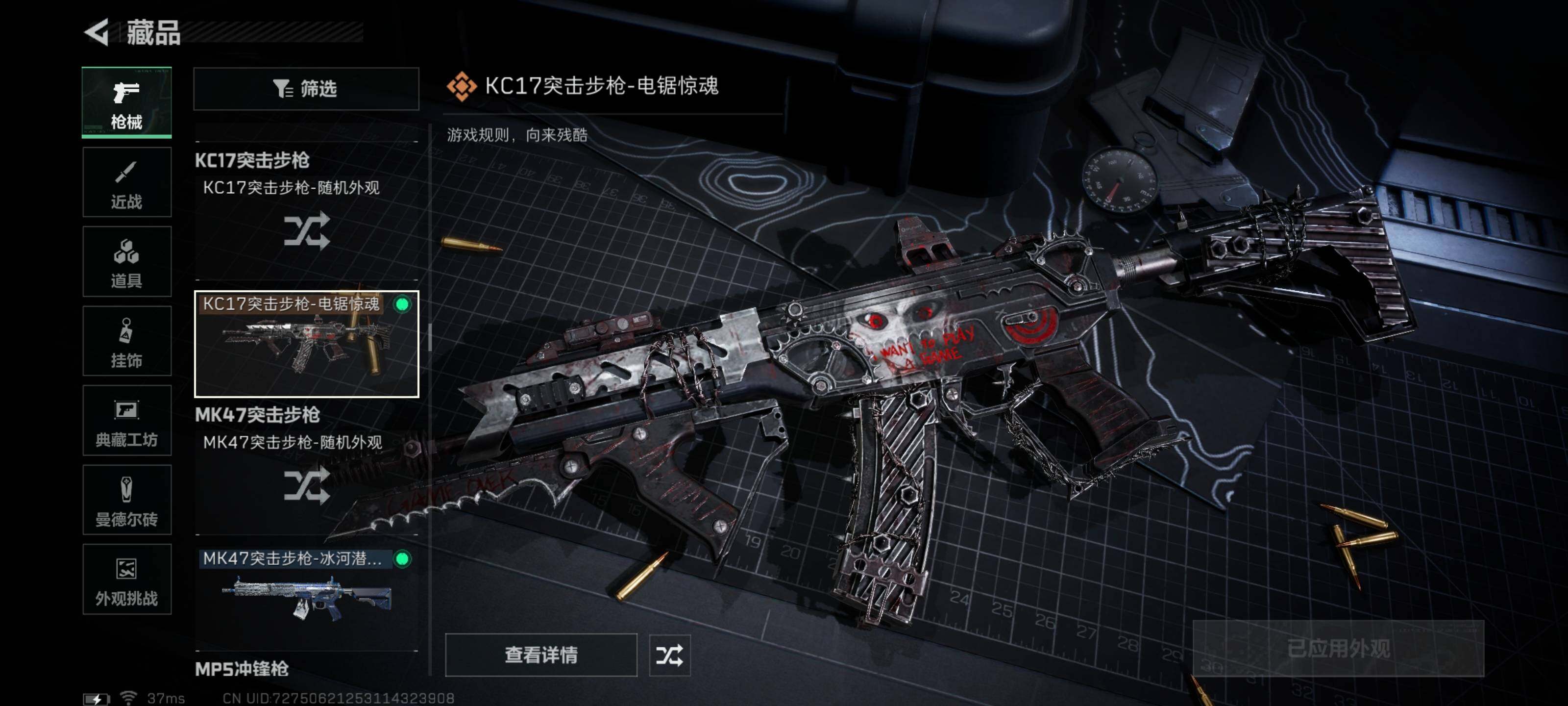 【史诗外观】:AKM突击步枪-林中猎手,QBZ95-1突击步枪-曙光,ASh-12战斗步枪-无极限,AUG突击步枪-蝮蛇,M7战斗步枪-百步穿杨,G3战斗步枪-流沙送葬,AS Val突击步枪-百步穿杨,腾龙突击步枪-猎鳄行动,K437突击步枪-守护者,MP5冲锋枪-深海恐惧,MP5冲锋枪-战术竞备,MP5冲锋枪-竞技风,Vector冲锋枪-阿萨拉文明,Vector冲锋枪-百步穿杨,SR-3M紧凑突击步枪-战术竞备,勇士冲锋枪-深海恐惧,勇士冲锋枪-工业狂潮,MP7冲锋枪-守护者,M1014霰弹枪-林中猎手,PKM通用机枪-蝮蛇,M250通用机枪-囚徒,Mini-14射手步枪-守护者,SVD狙击步枪-阿萨拉工艺,SV-98狙击步枪-林中猎手,SV-98狙击步枪-囚徒,M700狙击步枪-竞技风,M700狙击步枪-蝮蛇,M700狙击步枪-百步穿杨,M700狙击步枪-哈夫克警备,AWM狙击步枪-无极限,AWM狙击步枪-流沙送葬,沙漠之鹰-曙光,复合弓-守护者