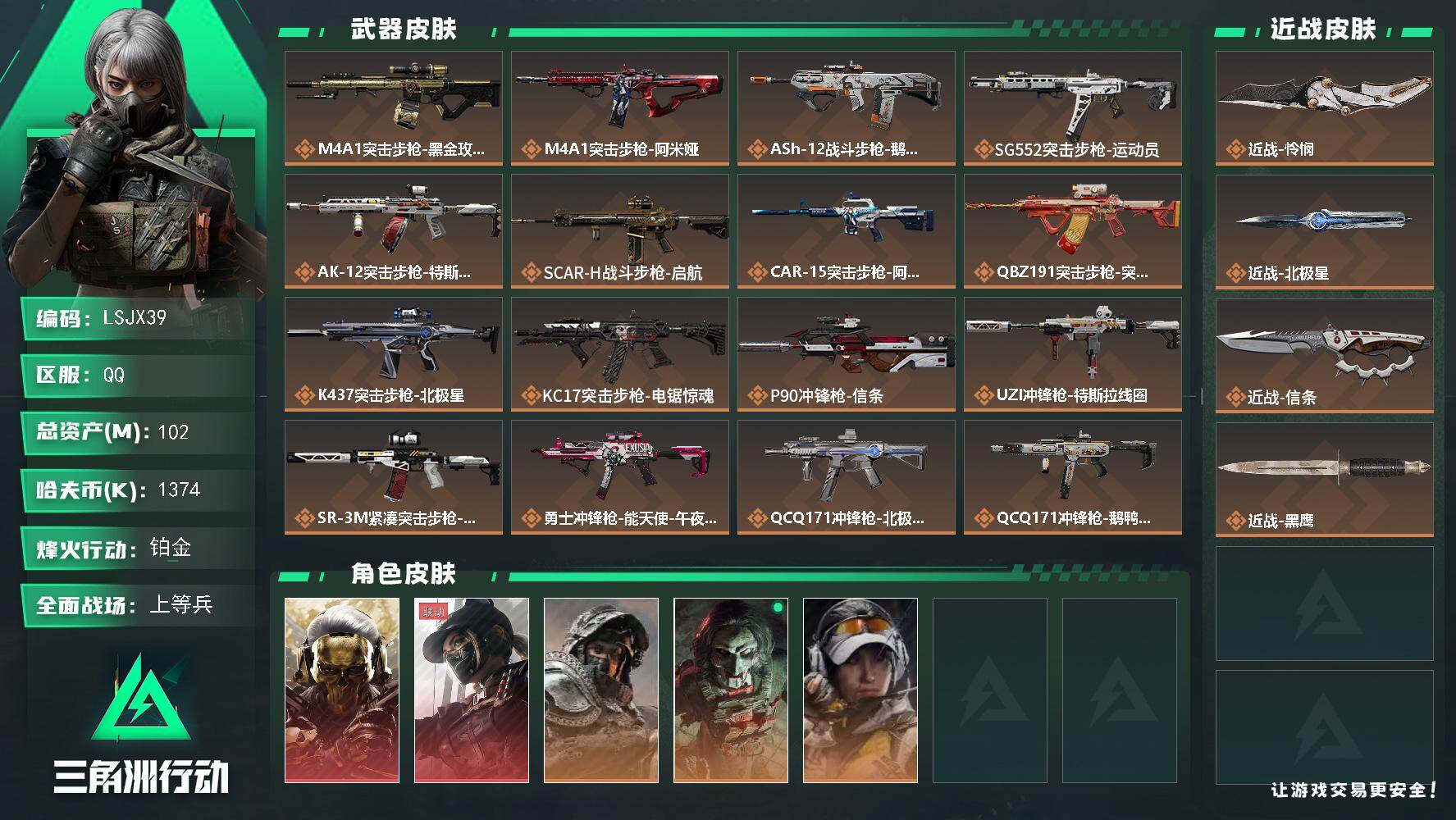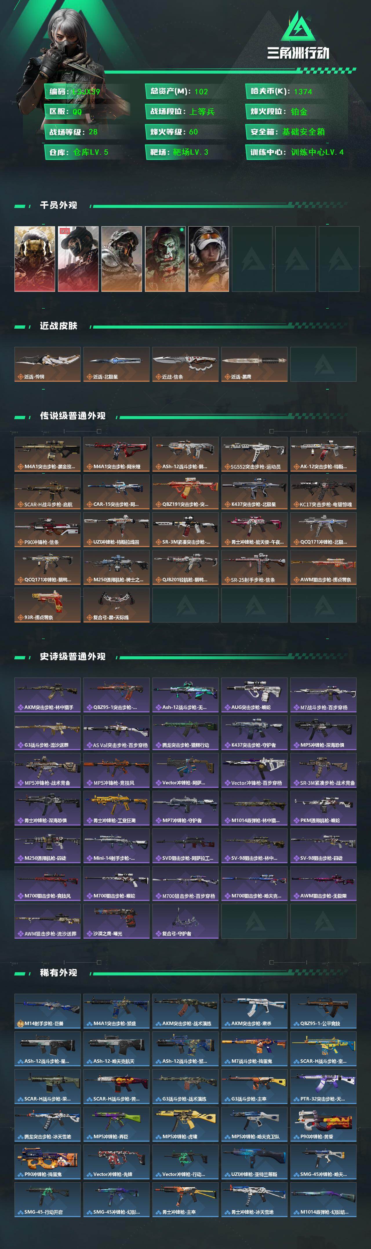 [16336215]【特价出售/店主推荐】102m总资产-1374k哈伏币-60烽火等级-铂金-28战场等级-上等兵 【干员外观】:红狼-蚀金玫瑰,露娜-黑·天际线,深蓝-不破誓约,红狼-电锯惊魂,露娜-金牌射手 【近战皮肤】:近战-怜悯,近战-北极星,近战-信条,近战-黑鹰 【传说外观】:M4A1突击步枪-蚀金玫瑰,M4A1突击步枪-阿米娅,ASh-12战斗步枪-鹅鸭杀,SG552突击步枪-运动员,AK-12突击步枪-特斯拉线圈,SCAR-H战斗步枪-启航,CAR-15突击步枪-阿米娅,腾龙突击步枪-捞点薯条,K437突击步枪-北极星,KC17突击步枪-电锯惊魂,P90冲锋枪-信条,UZI冲锋枪-特斯拉线圈,SR-3M紧凑突击步枪-特斯拉线圈,勇士冲锋枪-能天使-午夜邮差,QCQ171冲锋枪-北极星,QCQ171冲锋枪-鹅鸭杀,M250通用机枪-骑士之心,QJB201轻机枪-鹅鸭杀,SR-25射手步枪-信条,AWM狙击步枪-捞点薯条,93R-捞点薯条,复合弓-黑·天际线 【史诗外观】:AKM突击步枪-林中猎手,QBZ95-1突击步枪-曙光,ASh-12战斗步枪-无极限,AUG突击步枪-蝮蛇,M7战斗步枪-百步穿杨,G3战斗步枪-流沙送葬,AS Val突击步枪-百步穿杨,腾龙突击步枪-猎鳄行动,K437突击步枪-守护者,MP5冲锋枪-深海恐惧,MP5冲锋枪-战术竞备,MP5冲锋枪-竞技风,Vector冲锋枪-阿萨拉文明,Vector冲锋枪-百步穿杨,SR-3M紧凑突击步枪-战术竞备,勇士冲锋枪-深海恐惧,勇士冲锋枪-工业狂潮,MP7冲锋枪-守护者,M1014霰弹枪-林中猎手,PKM通用机枪-蝮蛇,M250通用机枪-囚徒,Mini-14射手步枪-守护者,SVD狙击步枪-阿萨拉工艺,SV-98狙击步枪-林中猎手,SV-98狙击步枪-囚徒,M700狙击步枪-竞技风,M700狙击步枪-蝮蛇,M700狙击步枪-百步穿杨,M700狙击步枪-哈夫克警备,AWM狙击步枪-无极限,AWM狙击步枪-流沙送葬,沙漠之鹰-曙光,复合弓-守护者 【稀有外观】:M14射手步枪-巨兽,M4A1突击步枪-繁盛,AKM突击步枪-战术演练,AKM突击步枪-肃杀,QBZ95-1突击步枪-公平竞技,ASh-12战斗步枪-星链科技,ASh-12战斗步枪-哈夫克航天,ASh-12战斗步枪-繁盛,M7战斗步枪-捣蛋鬼,SCAR-
