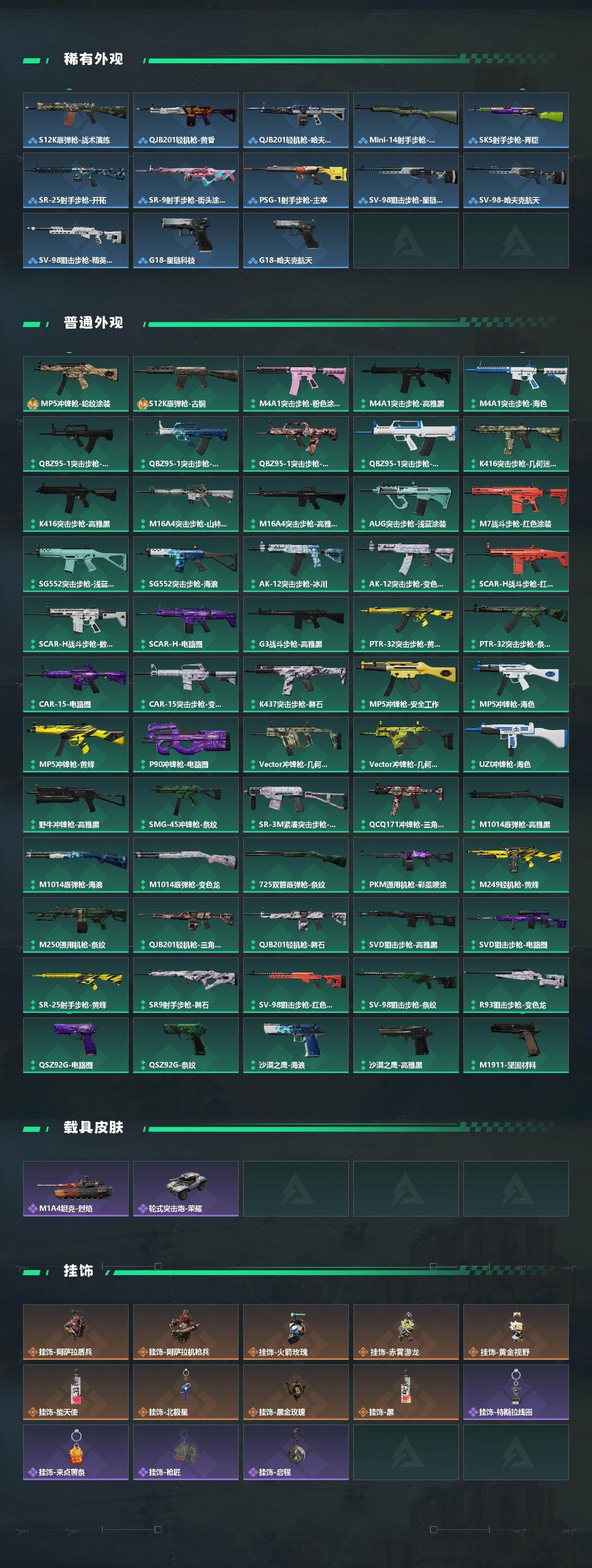 【稀有外观】:M14射手步枪-巨兽,M4A1突击步枪-繁盛,AKM突击步枪-战术演练,AKM突击步枪-肃杀,QBZ95-1突击步枪-公平竞技,ASh-12战斗步枪-星链科技,ASh-12战斗步枪-哈夫克航天,ASh-12战斗步枪-繁盛,M7战斗步枪-捣蛋鬼,SCAR-