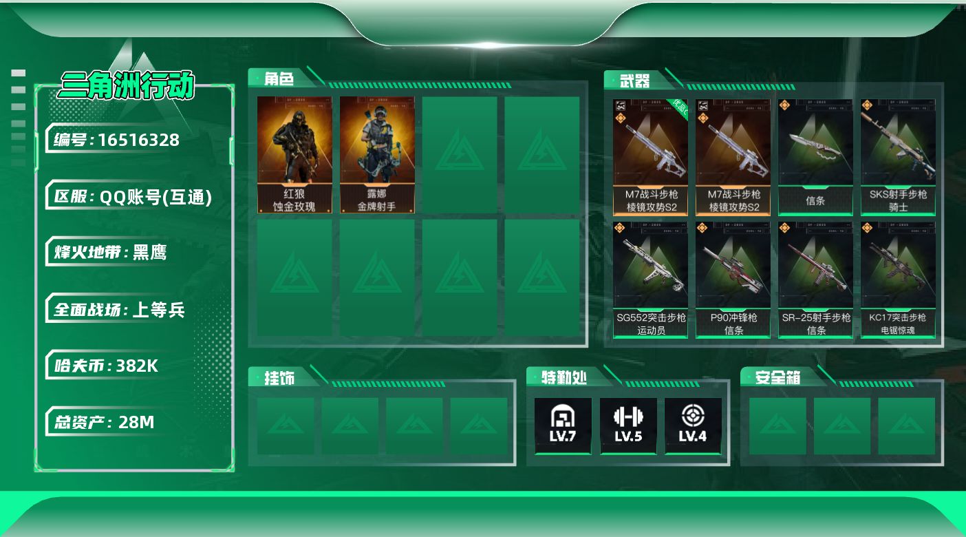 [16516328]【特价出售/店主推荐】 28m总资产-382k哈伏币-60烽火等级-黑鹰-25战场等级-上等兵 【干员外观】:红狼-蚀金玫瑰,露娜-金牌射手 【近战皮肤】:近战-信条,近战-黑鹰 【典藏外观】:M7战斗步枪-棱镜攻势S2 【典藏外观成色】:M7战斗步枪-棱镜攻势S2(优品C) 【传说外观】:M4A1突击步枪-蚀金玫瑰,SG552突击步枪-运动员,KC17突击步枪-电锯惊魂,P90冲锋枪-信条,M14射手步枪-蛮荒,SKS射手步枪-骑士,SR-25射手步枪-信条 【史诗外观】:K416突击步枪-冬日风情,M7战斗步枪-百步穿杨,G3战斗步枪-流沙送葬,AS Val突击步枪-百步穿杨,MP5冲锋枪-竞技风,Vector冲锋枪-百步穿杨,勇士冲锋枪-深海恐惧,S12K霰弹枪-曙光,PKM通用机枪-阿萨拉特攻,M249轻机枪-丛影谍踪,M250通用机枪-囚徒,QJB201轻机枪-炽焰,SVD狙击步枪-阿萨拉工艺,M14射手步枪-工业狂潮, M14射手步枪-航天庆典,M700狙击步枪-百步穿杨,AWM狙击步枪-流沙送葬 【稀有外观】:M4A1突击步枪-繁盛,AKM突击步枪-肃杀,ASh-12战斗步枪-繁盛,K416突击步枪-一帆风顺,M7战斗步枪-精英联盟,M7战斗步枪-捣蛋鬼,SG552突击步枪-2026,SG552突击步枪-马年新春,SG552突击步枪-贴花艺术,SCAR-H战斗步枪-荣耀列队,SCAR-H战斗步枪-精英联盟,G3战斗步枪-主宰,CAR-15突击步枪-来财,AS Val-精英联盟 ,腾龙突击步枪-冰天雪地,K437突击步枪-生存指令,MK47突击步枪-精英联盟,MP5冲锋枪-哈夫克卫队,Vector冲锋枪-先锋,UZI冲锋枪-亚特兰蒂斯,SMG-45-行动开启,SMG-45冲锋枪-幻影结构,勇士冲锋枪-主宰,勇士冲锋枪-冰天雪地,M249轻机枪-冰天雪地,QJB201轻机枪-哈夫克卫队,SR9射手步枪-肃杀,PSG-1射手步枪-主宰,SV-98狙击步枪-星链科技,SV-98狙击步枪-哈夫克航天,SV-98狙击步枪-精英联盟 【普通外观】:沙漠之鹰-蛇纹涂装,M4A1突击步枪-粉色涂装,M4A1突击步枪-高雅黑,QBZ95-1突击步枪-海浪,QBZ95-1突击步枪-海色,QBZ95-1突击步枪-2026,K416突击步枪-几何迷彩,K416突击步枪-高雅黑