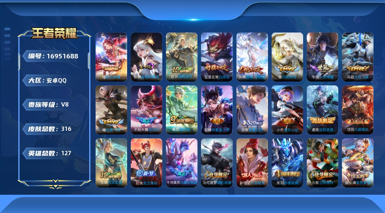 [16951688]可二次【特价出售/店主推荐】安卓Q-V8-最强王者段位-127英雄-315皮肤-1典藏皮肤-13传说-84史诗-1星元