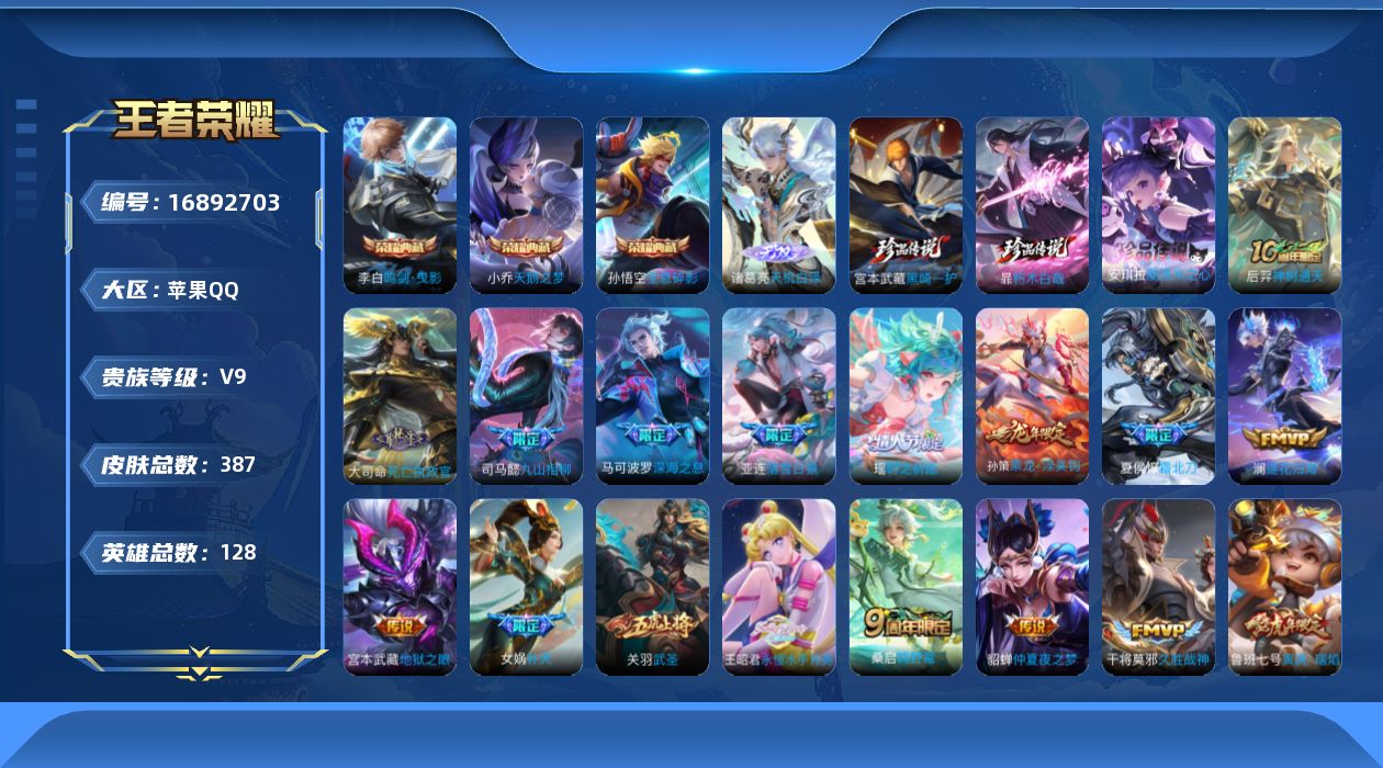 [16892703]【特价出售/店主推荐】苹果Q-V9-至尊星耀IV段位-128英雄-387皮肤-3典藏皮肤-1无双-3珍品传说-32传说-117史诗