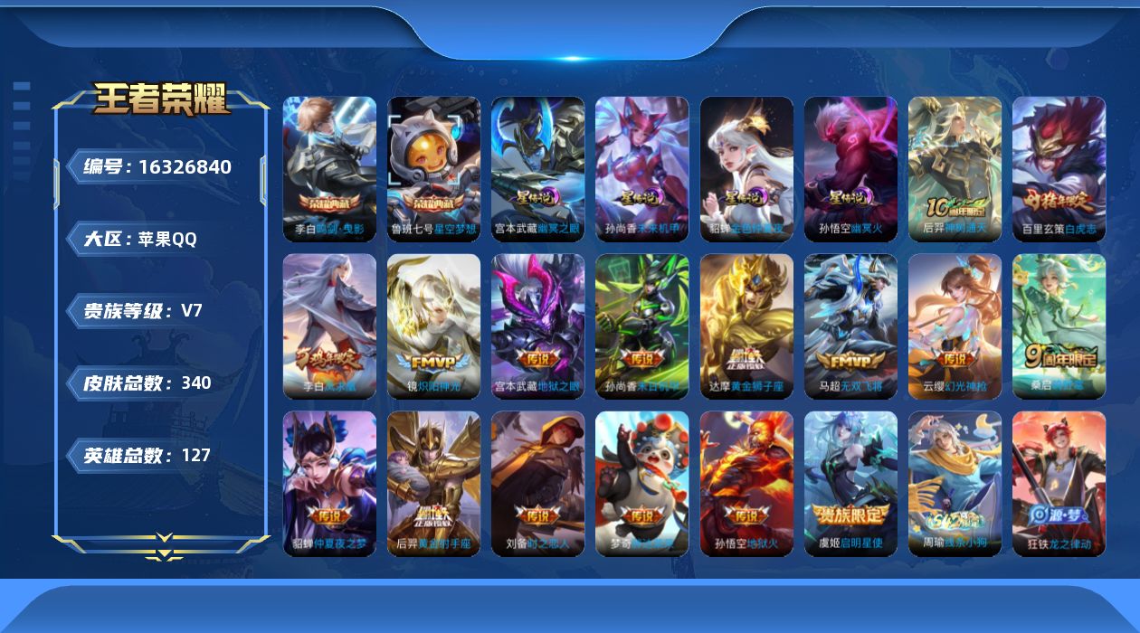 [16326840]可二次【特价出售/店主推荐】苹果Q-V7-永恒钻石III段位-127英雄-340皮肤-2典藏皮肤-16传说-82史诗-5星元