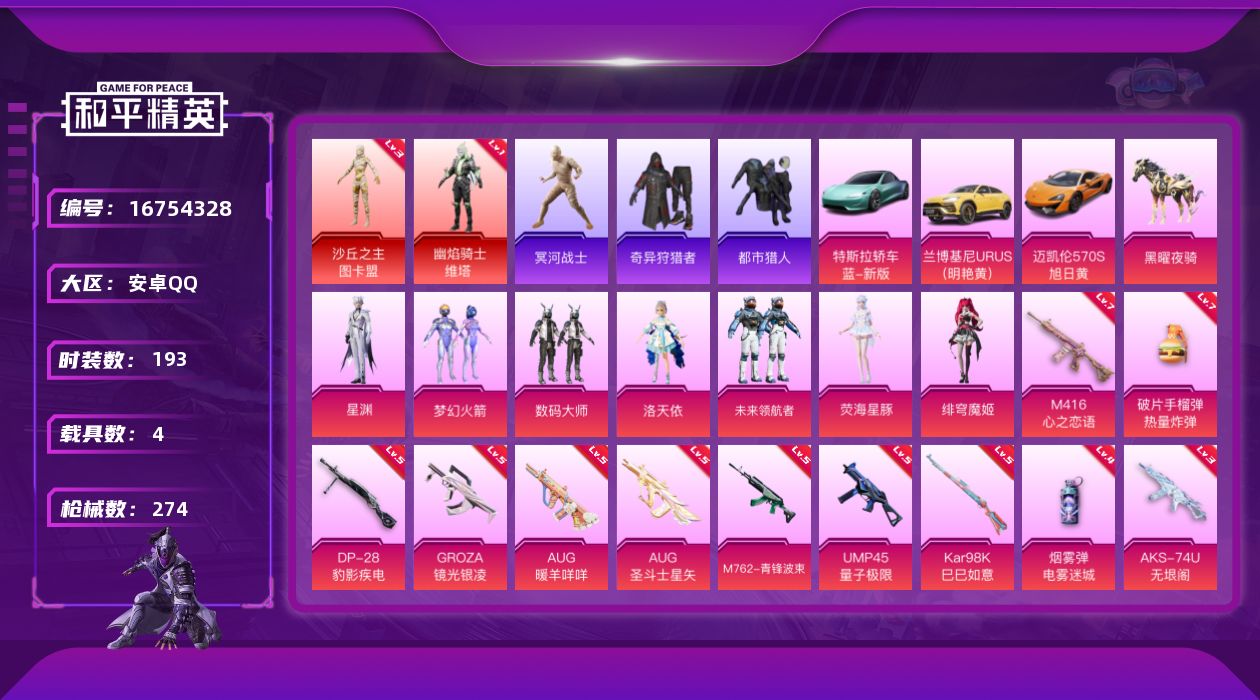 [16754328]安卓 手Q-2神装-7粉装-15特效枪-4载具-9粉色飞行器-100229热力值-13王牌印记-193套装-274枪皮