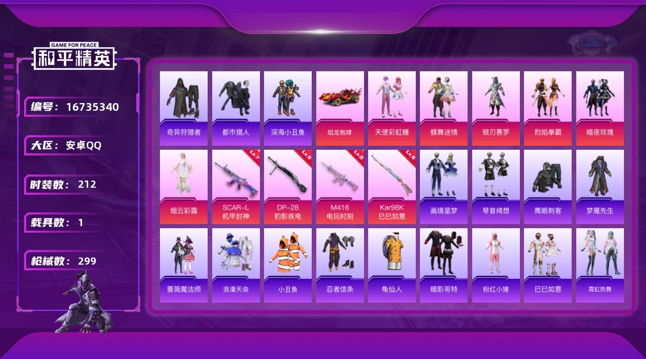 【粉色枪皮等级】:SCAR-L-机甲封神(七级),M416-电玩时刻(五级),AKS-74U-森灵之息(五级),Kar98K-巳巳如意(五级),DP-28-豹影疾电(五级)