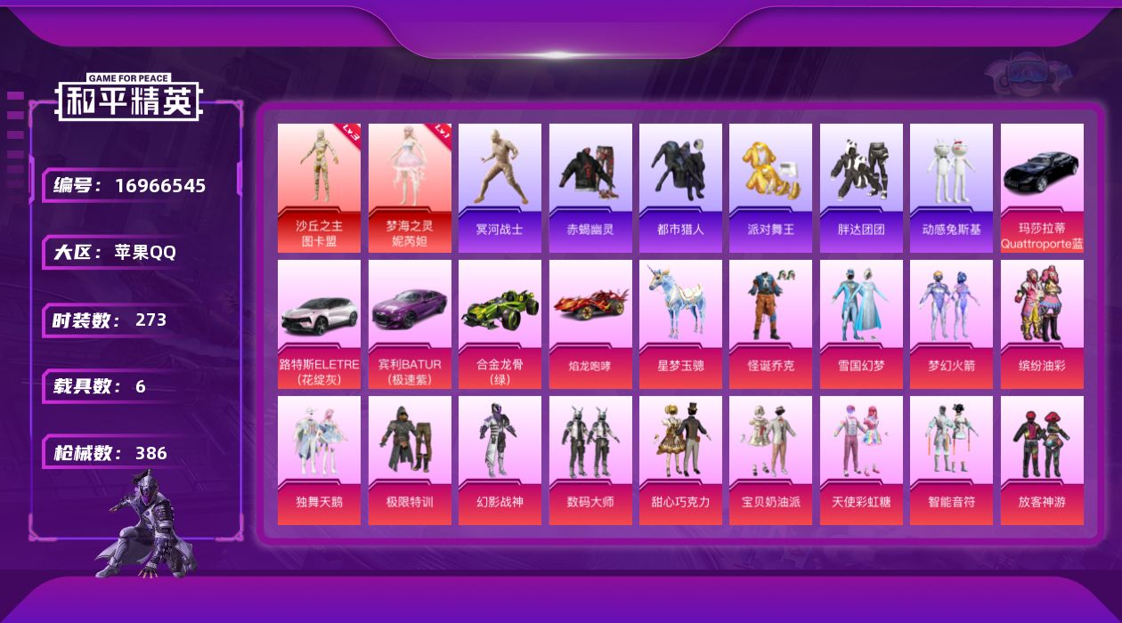 - [13131905]素材身法号/地铁满天赋 苹果 手Q-30粉装-11特效枪-4载具-8粉色飞行器-11.7w热力值-19王牌印记-231套装-321枪皮【热门品类】:粉装-怪诞乔克,粉装-缤纷油彩,套装-派对舞王,角色-2B战斗服款,套装-龟仙人,套装-粉红小猪,角色-8号机,角色-Mark.06,小丑红鼻头【粉色载具】:路特斯ELETRE(冰川蓝),迈凯伦塞纳(冷萃蓝),合金龙骨(蓝),僚机-萌兔起飞【粉色套装】:粉装-怪诞乔克,粉装-宝贝奶油派,粉装-天使彩虹糖,粉装-缤纷油彩,粉装-绚金战神,粉装-虎啸骄阳,粉装-飓风飞鹰,粉装-银龙傲海,粉装-山涧鹿灵,角色-洛天依,粉装-薄荷物语,粉装-恐龙拽拽,粉装-彩虹甜喵,粉装-冰川幽秘,粉装-纯珍童话,角色-呆萌星弥,角色-宙之时溯,粉装-莲影清波,粉装-傲傲奶龙,角色-紫钛骑兵,粉装-蜜语绒猫,角色-电磁星,套装-创世·救赎,角色-初号机 觉醒Ver.,角色-金域紫灵,角色-智耀战神,角色-荧海星豚,角色-奇迹舞步 美雪,角色-羊梦糖心【粉色枪皮等级】:AKM-梦之光华(六级),M416-心之恋语(六级),P90-沙丘之主(六级),Kar98K-巳巳如意(五级),Kar98K-圣域龙灵(三级),M24-镜域双华(三级),M417-第五大道(二级),MK12-雪月幻音(五级),DP-28-暗夜鎏金(七级),DP-28-豹影疾电(五级),破片手榴弹-美味星星糖(七级)【粉色飞行器】:梦之光华飞行器,沙丘之主天马,镜域双华-灵镜之阶,龙翔九天飞行器,圣域金龙飞行器,幻星舰长飞行器,终晖之翼飞行器
