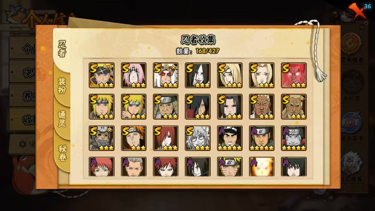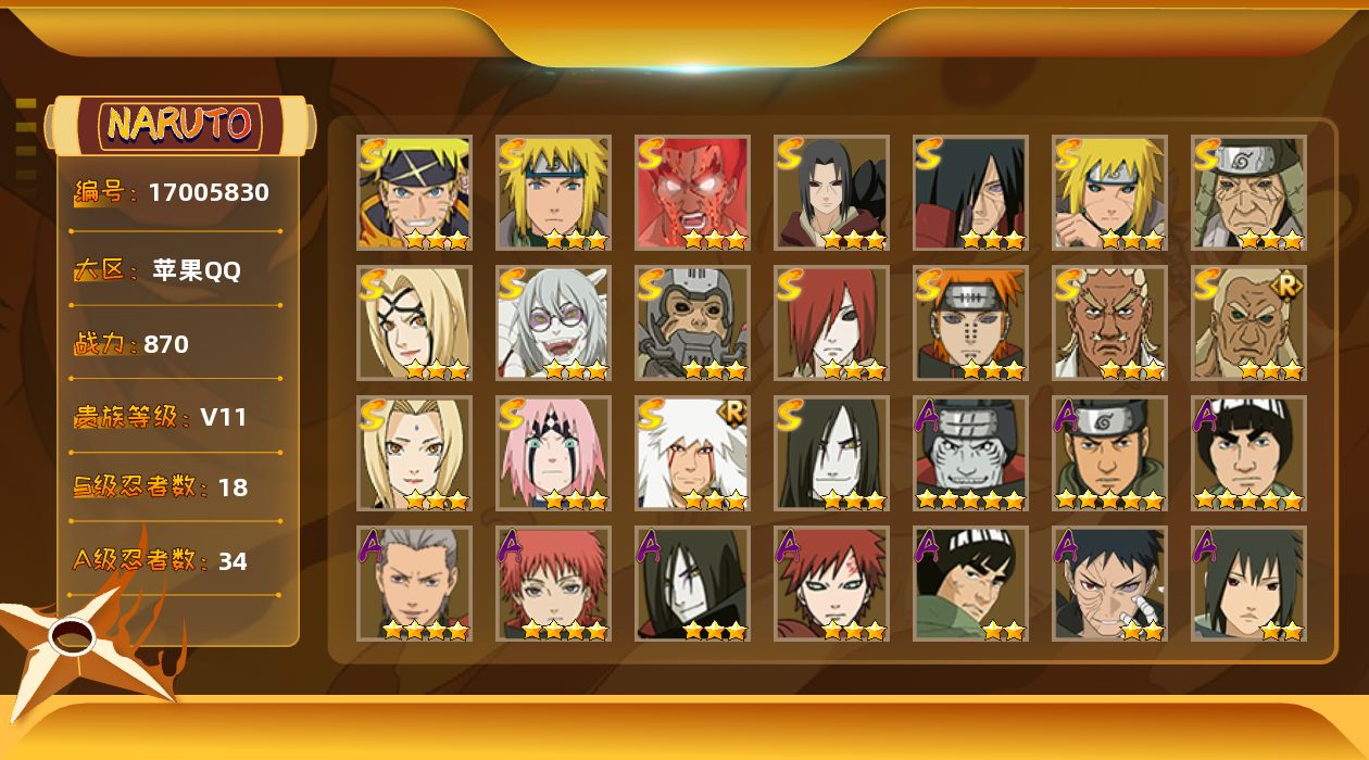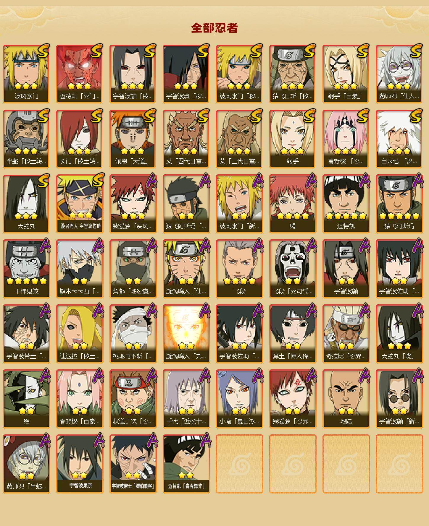 【S级忍者】:长门「秽土转生」(3星),半藏「秽土转生」(3星),猿飞日斩「秽土转生」(3星),波风水门「秽土转生」(3星),宇智波鼬「秽土转生」(3星),宇智波斑「秽土转生」(3星),春野樱「忍界大战」(3星),艾「四代目雷影」(3星),艾「三代目雷影」(3星),自来也「舞之豪杰」(3星),大蛇丸(3星),纲手(3星),纲手「百豪」(3星),波风水门(3星),药师兜「仙人模式」(3星),迈特凯「死门」(3星),佩恩「天道」(3星),漩涡鸣人·宇智波佐助(3星)