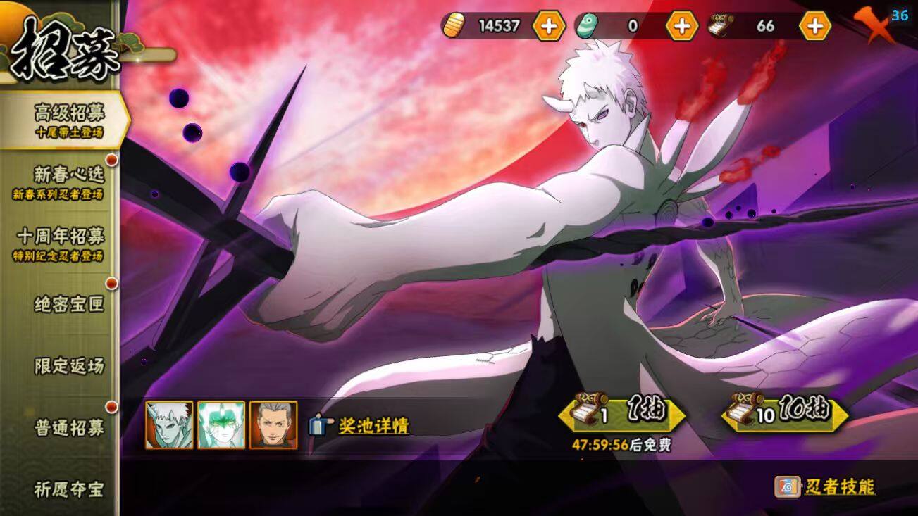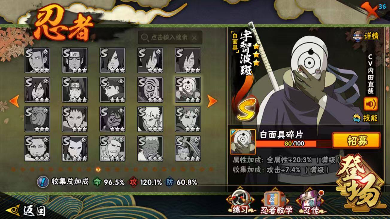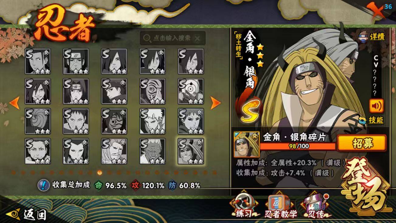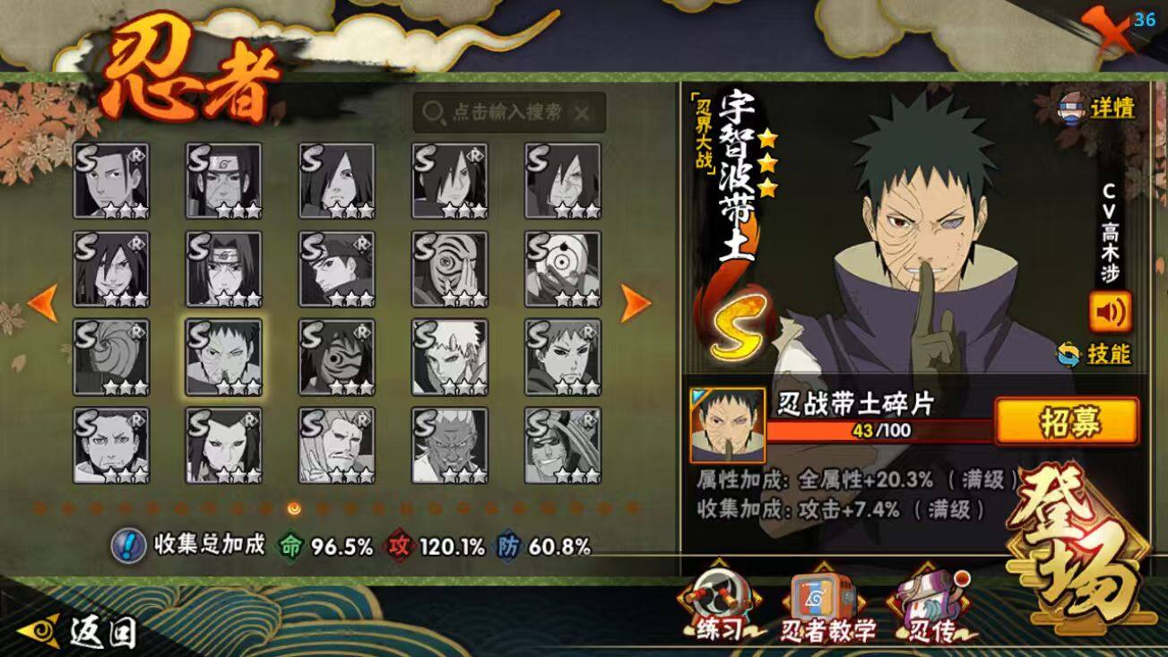【S级忍者】:长门「秽土转生」(3星),半藏「秽土转生」(3星),猿飞日斩「秽土转生」(3星),波风水门「秽土转生」(3星),宇智波鼬「秽土转生」(3星),宇智波斑「秽土转生」(3星),春野樱「忍界大战」(3星),艾「四代目雷影」(3星),艾「三代目雷影」(3星),自来也「舞之豪杰」(3星),大蛇丸(3星),纲手(3星),纲手「百豪」(3星),波风水门(3星),药师兜「仙人模式」(3星),迈特凯「死门」(3星),佩恩「天道」(3星),漩涡鸣人·宇智波佐助(3星)