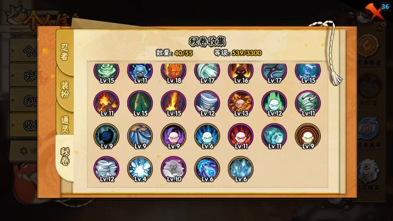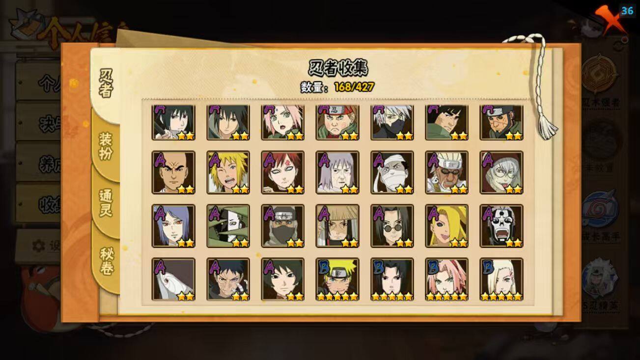 【A级忍者】:波风水门「新春限定」(2星),迪达拉「秽土转生」(2星),大蛇丸「晓」(3星),奇拉比「忍界大战」(2星),飞段(4星),飞段「死司凭血」(2星),干柿鬼鲛(5星),漩涡鸣人「仙人模式」(2星),漩涡鸣人「九尾查克拉」(2星),迈特凯(5星),旗木卡卡西「万花筒写轮眼」(2星),桃地再不斩「漂泊武士」(2星),我爱罗「疾风传」(3星),我爱罗「忍界大战」(2星),蝎(4星),小南「夏日泳装」(2星),角都「地怨虞」(2星),猿飞阿斯玛(5星),猿飞阿斯玛「秽土转生」(2星),宇智波鼬(2星),宇智波鼬「新春限定」(2星),宇智波佐助「须佐能乎」(2星),宇智波佐助「万花筒写轮眼」(2星),药师兜「半蛇斗篷」(2星),绝(2星),宇智波带土「暴怒」(2星),宇智波带土「漂泊浪客」(2星),黑土「博人传」(2星),春野樱「百豪」(2星),秋道丁次「忍界大战」(2星),千代「近松十人卫」(2星),地陆(2星),宇智波泉奈(2星),迈特凯「青春爆炸」(2星)