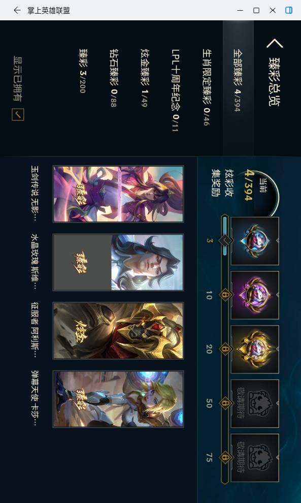 【臻彩皮肤】:征服者阿利斯塔炫金,玉剑传说无影竞星,弹幕天使卡莎炽天使公正,水晶玫瑰斯维因纯洁花蕾