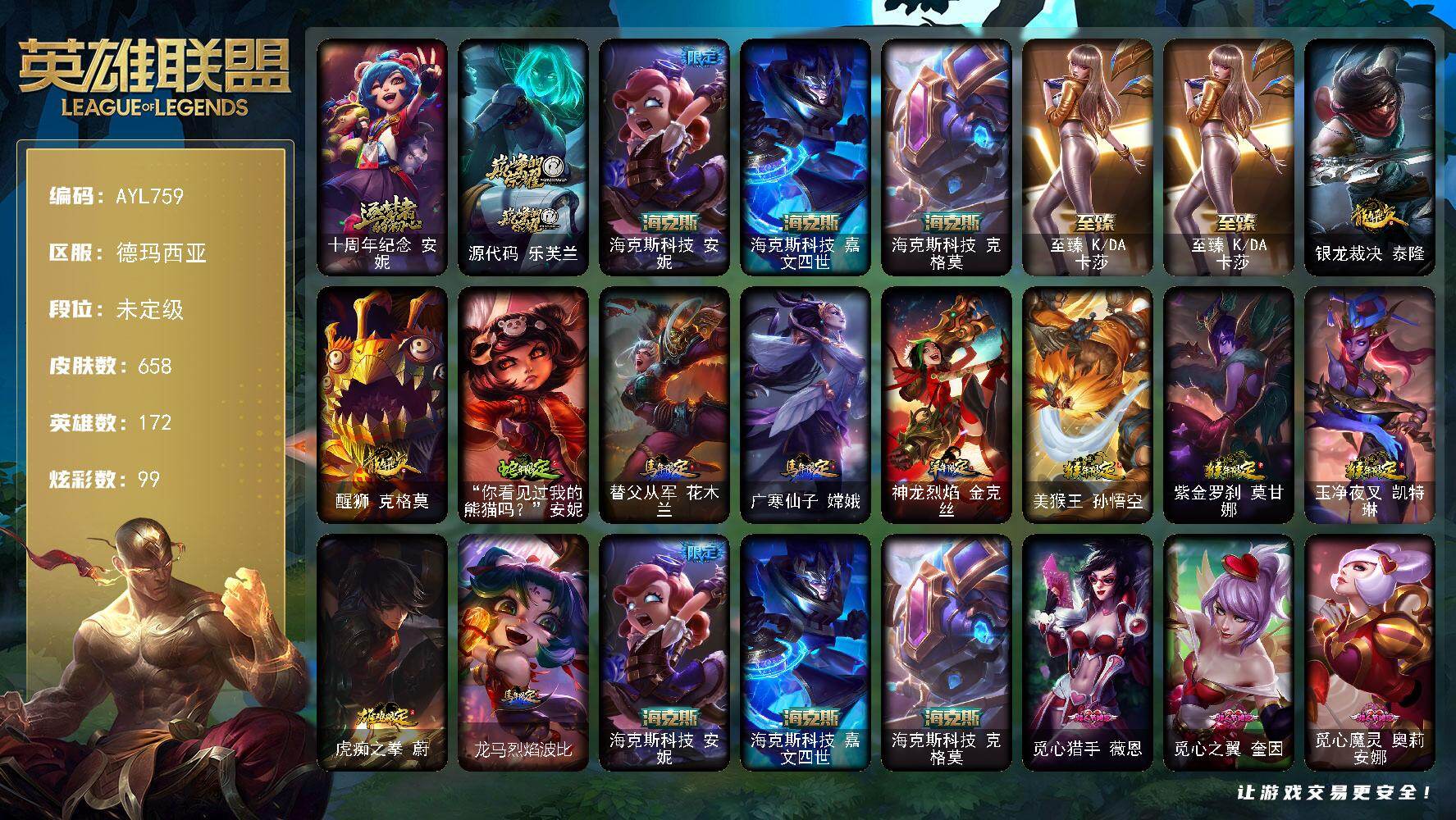 [16965023]未定级段位-172英雄-658皮肤-99炫彩-3终极-6神话-120限定-55传说-177史诗 【神话皮肤】:十周年纪念安妮,源代码乐芙兰,海克斯科技安妮,海克斯科技嘉文四世,海克斯科技克格莫,至臻KDA卡莎 【至臻皮肤】:至臻KDA卡莎 【臻彩皮肤】:征服者阿利斯塔炫金,玉剑传说无影竞星,弹幕天使卡莎炽天使公正,水晶玫瑰斯维因纯洁花蕾 【年限皮肤】:银龙裁决泰隆,醒狮克格莫,你看见过我的熊猫吗安妮,替父从军花木兰,广寒仙子嫦娥,神龙烈焰金克丝,美猴王孙悟空,紫金罗刹莫甘娜,玉净夜叉凯特琳,虎痴之拳蔚,龙马烈焰波比 【海克斯皮肤】:海克斯科技安妮,海克斯科技嘉文四世,海克斯科技克格莫 【情人节限定】:觅心猎手薇恩,觅心之翼奎因,觅心魔灵奥莉安娜 【冰雪限定】:幸福女神乐芙兰,冰雪风暴希维尔,圣诞开心鬼提莫,圣诞精灵崔丝塔娜,圣诞狂欢努努和威朗普,圣诞糖果棒厄运小姐,圣诞狂欢基兰,狂心冰王图奇,阿木木“主人不要我了”,胡桃夹子萨科,平安夜女神娑娜,英勇玩具兵普朗克,冬季仙境卡尔玛,邪恶圣诞老人维迦,喜庆之树茂凯,冬季仙境奥莉安娜,雪默丁格,圣诞玩偶波比,冰雪驯鹿波比,圣诞老人古拉加斯,圣诞驯鹿克格莫,雪球也能爆炸吉格斯,寒冬精灵璐璐,圣诞老人德莱文,圣诞老人布隆,冰雪节辛吉德,冰雪女神辛德拉,冰雪兽纳尔 【终极皮肤】:DJ娑娜,灵魂守卫乌迪尔,未来战士伊泽瑞尔 【限定皮肤】:奥斯曼大帝普朗克,巨角幻兽阿利斯塔,舞会公主安妮,斩星魔剑易,冠军典狱长锤石,冠军之血希瓦娜,冠军之刃锐雯2016,冠军之箭艾希,Fnatic古拉加斯,Fnatic迦娜,Fnatic嘉文四世,Fnatic卡尔萨斯,Fnatic库奇,暗杀星奥莉安娜,暗杀星蒙多,暗杀星努努和威朗普,暗杀星慎,SKTT1贾克斯,SKTT1婕拉,SKTT1薇恩,SSW辛吉德,SSW图奇,SSW锤石,SKTT1阿利斯塔,SKTT1阿兹尔,SKTT1卡莉丝塔,SKTT1雷克顿,SKTT1瑞兹,SKTT1奥拉夫,SKTT1烬,SKTT1娜美,SKTT1辛德拉,SKTT1扎克,勇敢的心德莱厄斯,电玩女神厄运小姐,电玩勇者锐雯,暗裔英雄盖伦,胜利女神奥莉安娜,海贼瑞兹,南瓜头费德提克,灵魂收割者索拉卡,死亡誓约卡特琳娜,鬼影重重魔腾,鬼影森森茂凯,死亡誓约维克托,无头骑士赫卡里姆,魅惑女巫崔丝塔娜,魅惑女巫莫甘娜,糖果使徒费德提
