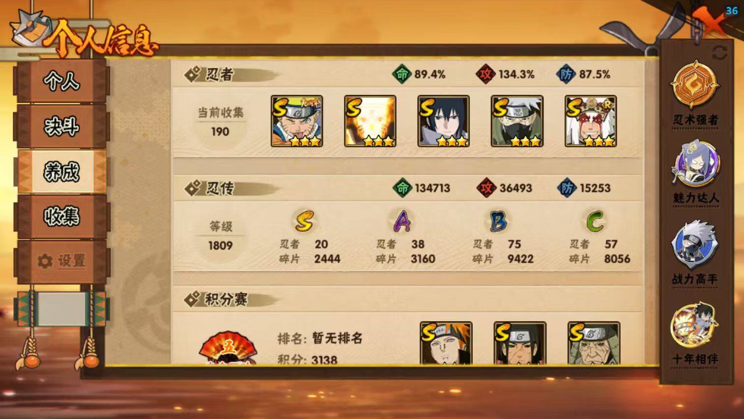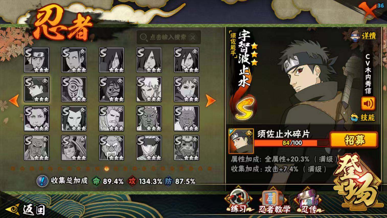[17005984]20S级忍者数-38A级忍者数 【S级忍者】:猿飞日斩「秽土转生」(3星),波风水门「秽土转生」(3星),千手柱间「秽土转生」(3星),宇智波鼬「秽土转生」(3星),宇智波斑「秽土转生·解」(3星),宇智波带土「忍界大战」(3星),宇智波鼬「须佐能乎」(3星),旗木卡卡西「须佐能乎」(3星),宇智波斑「木叶创立」(3星),自来也「舞之豪杰」(3星),大蛇丸(3星),自来也「传说中的三忍」(3星),波风水门(3星),漩涡鸣人「九喇嘛连结」(3星),佩恩「天道」(3星),宇智波佐助「永恒万花筒」(3星),宇智波斑 「白面具」(3星宇智波斑「白面具」),波风水门「九喇嘛连结」(3星),宇智波斑「五影会谈」(3星),漩涡鸣人·宇智波佐助(3星) 【A级忍者】:艾「青年」(2星),长门「青年」(2星),波风水门「青年」(2星),达鲁伊「博人传」(2星),迪达拉(2星),大蛇丸「晓」(2星),飞段(4星),飞段「死司凭血」(2星),干柿鬼鲛(5星),漩涡博人「桃式显现」(2星),漩涡鸣人「仙人模式」(2星),漩涡鸣人「九尾查克拉」(2星),机械鸣人「初始形态」(2星),迈特凯(5星),桃地再不斩「秽土转生」(2星),我爱罗「疾风传」(3星),蝎(3星),蝎「绯流琥」(2星),猿飞阿斯玛(5星),宇智波鼬「夏日限定」(2星),宇智波佐助「须佐能乎」(2星),宇智波佐助「万花筒写轮眼」(2星),照美冥「五代目水影」(2星),日向宁次「忍界大战」(2星),日向雏田「最终章」(2星),黑绝(2星),长十郎「六代目水影」(2星),李洛克「忍界大战」(2星),黑土「博人传」(2星),春野樱「百豪」(2星),秋道丁次「忍界大战」(2星),千代「近松十人卫」(2星),土台「忍界大战」(2星),宇智波泉奈(2星),不动(2星),大野木「侠隐江湖」(2星),巳月「仙人模式」(2星),迈特凯「青春爆炸」(2星)